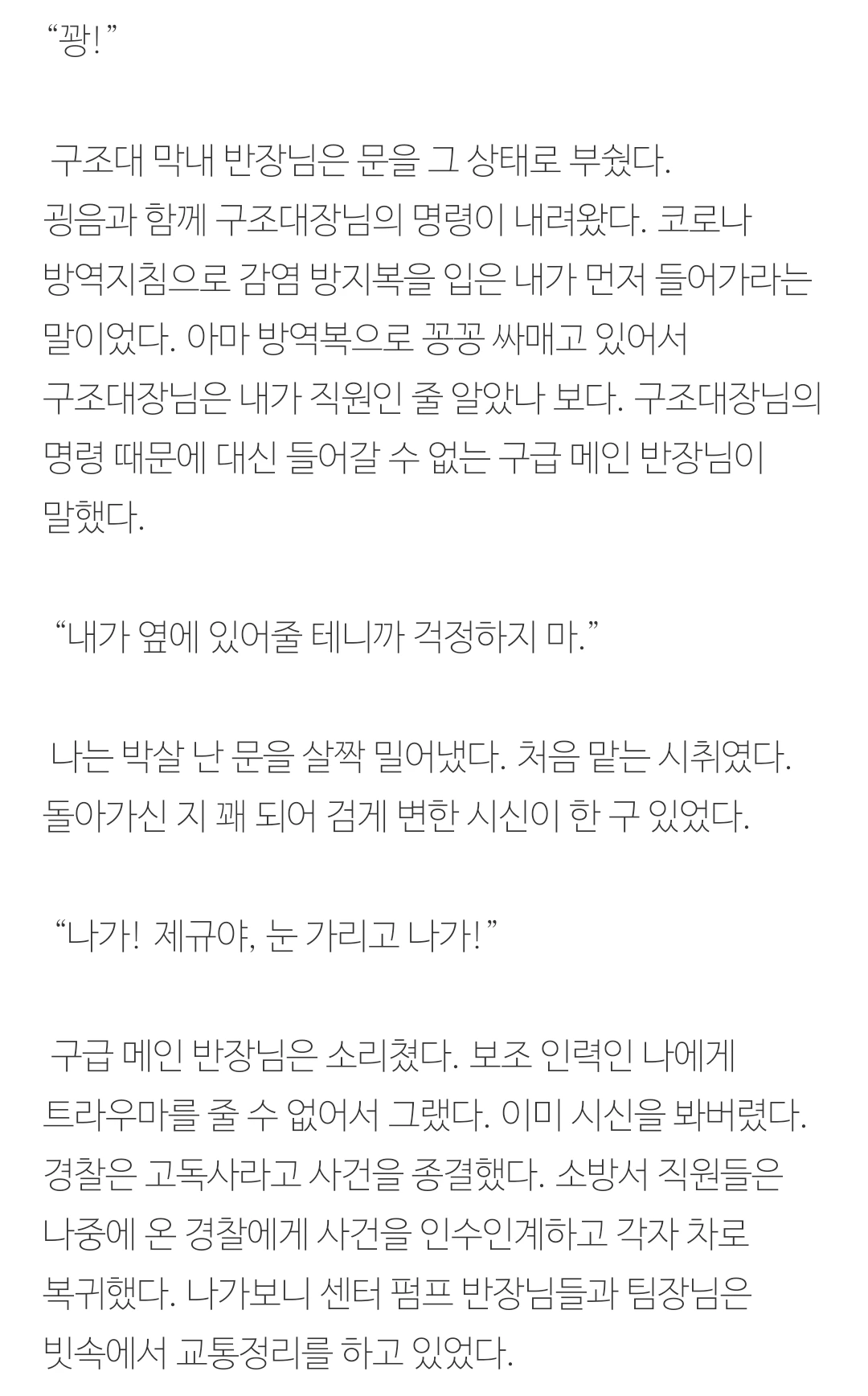 자기가 무슨 글이냐고 안 쓴다더니 저한테 집필비 받고 나서야 스마트폰으로 글을 쓰더라고요. 제목은 <119안전센터 특식 일지>. 문고판 분량으로 350매 정도로 쓴 글은 어쩌다 보니 그냥 잠자고 있었어요.