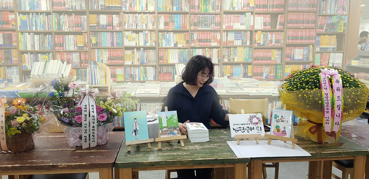 저는 문필업계의 거시기. 그러니까 쪼렙. 사인회 한다고 독자들이 막 몰려들지는 않아요. 스무 살 때부터 봐온 유재임 선배님, 에세이 2기와 5기 선생님들, 정우와 정은이, 언젠가 코로나 백신 휴가 맞아서 <나는 언제나 당신들의 지영이>에 사인받으러 오신 공직자님, 강성옥 씨 후배 승규님과 종한님.