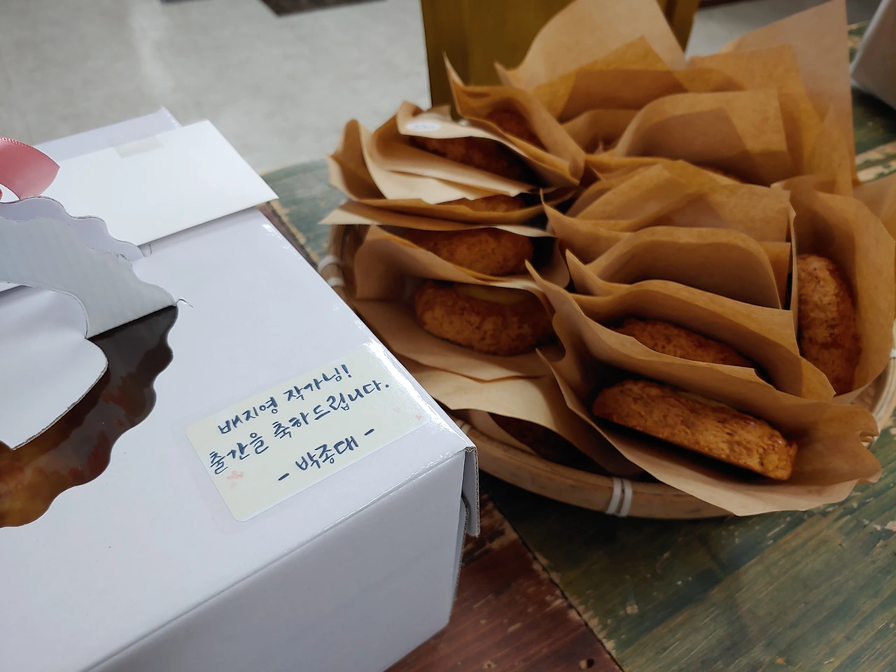 배지영 작가 신간 나올 때마다 ‘연쇄선물마’로 활동하는 행복한 치과 박종대 원장님이 케이크와 크림치즈스콘을 아주 많이 보내주셨어요. 진료하실 때는 환자 말을 그렇게도 잘 들어주고 친절하신데, 현실에서는 참 말이 안 통하시는 분이네요.