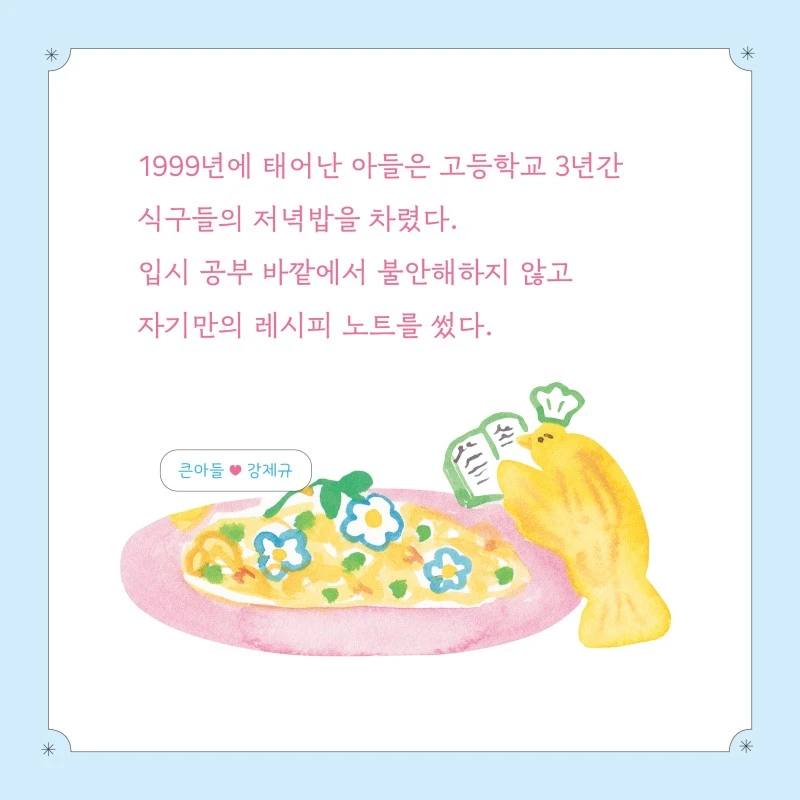 오늘 아침 메뉴는 호박볶음, 박대구이, 달걀 스크럼블, 만둣국, 배추김치, 멸치볶음, 거기에 단감 하나. 아침에는 강성옥 씨가 차려준 밥을 먹고 낮에는 사계절 출판사에서 만들어준 카드뉴스를 올립니다.