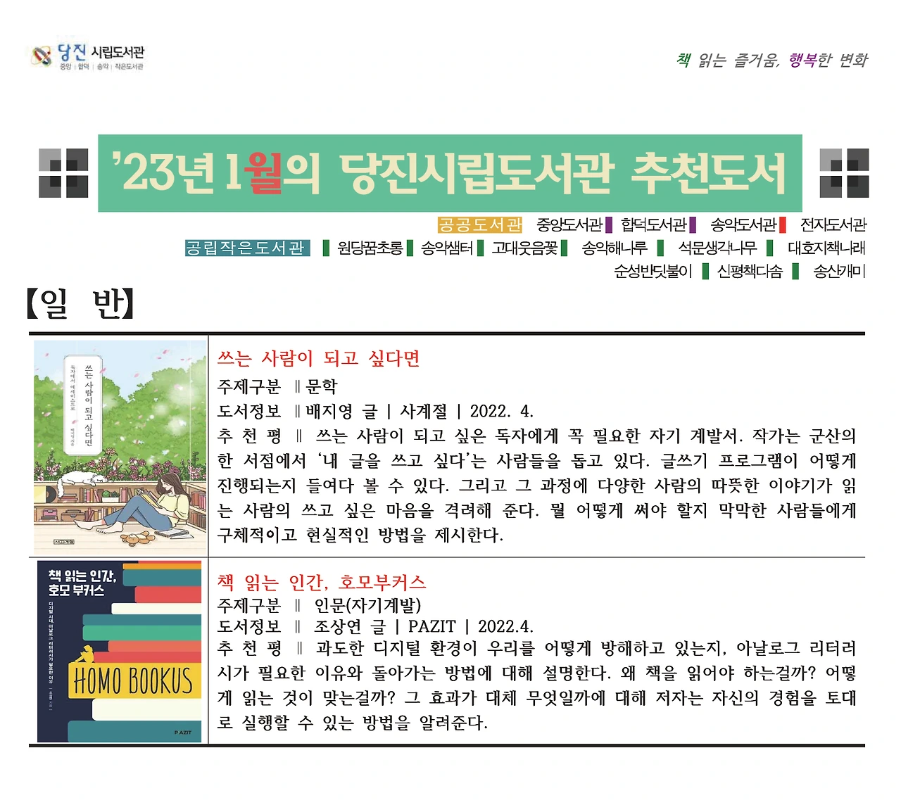 2023년 1월. 당진시립중앙도서관의 추천 도서 중 한 권은 <쓰는 사람이 되고 싶다면>. 당진의 크고 작은 도서관마다 책이 싹 들어가고 시정 홍보지에 실려 아파트 출입구에 붙는다고 한다. <쓰는 사람이 되고 싶다면> 강연도 따로 잡혀 있다. 되게 고맙고 영광입니다.