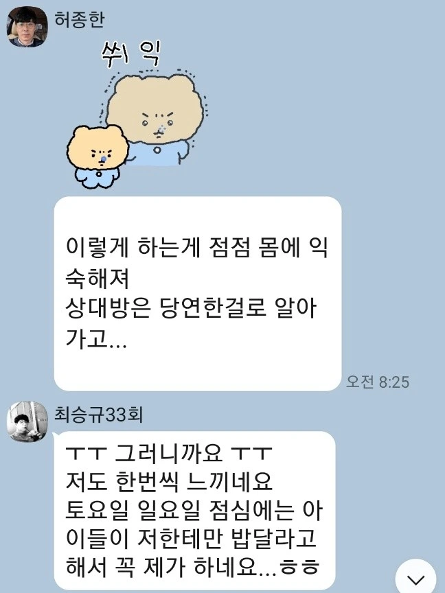 최승규 : ㅠㅠ 그러니까요. 저도 한 번씩 느끼네요. 토요일 일요일 점심에는 아이들이 저한테만 밥달라고 해서 꼭 제가 하네요... ㅎㅎ