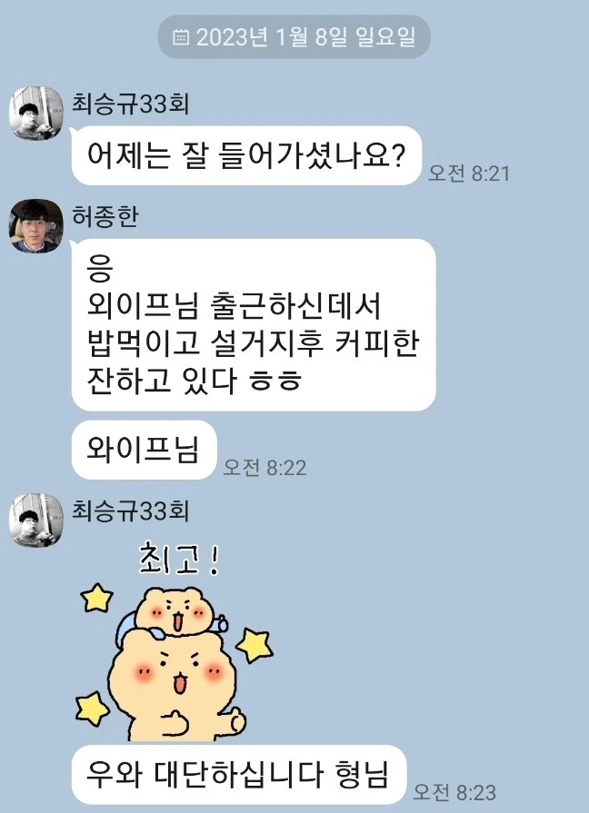 허종한 : 응. 와이프님 출근하신대서 밥 먹이고 설거지 후 커피 한 잔 하고 있다. ㅎㅎ