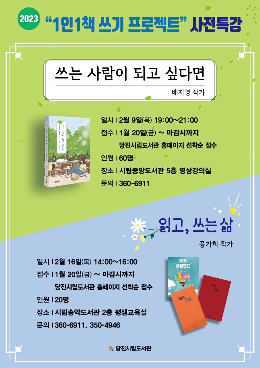 2월부터 10월까지 총 16회, 한 달에 두 번씩 당진시립중앙도서관에서 글쓰기 수업한다. ‘내 책’을 도모하는 글쓰기이므로 12월에는 출판기념회도 할 거다.