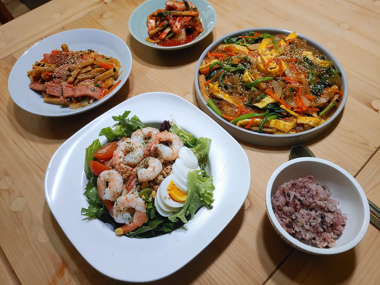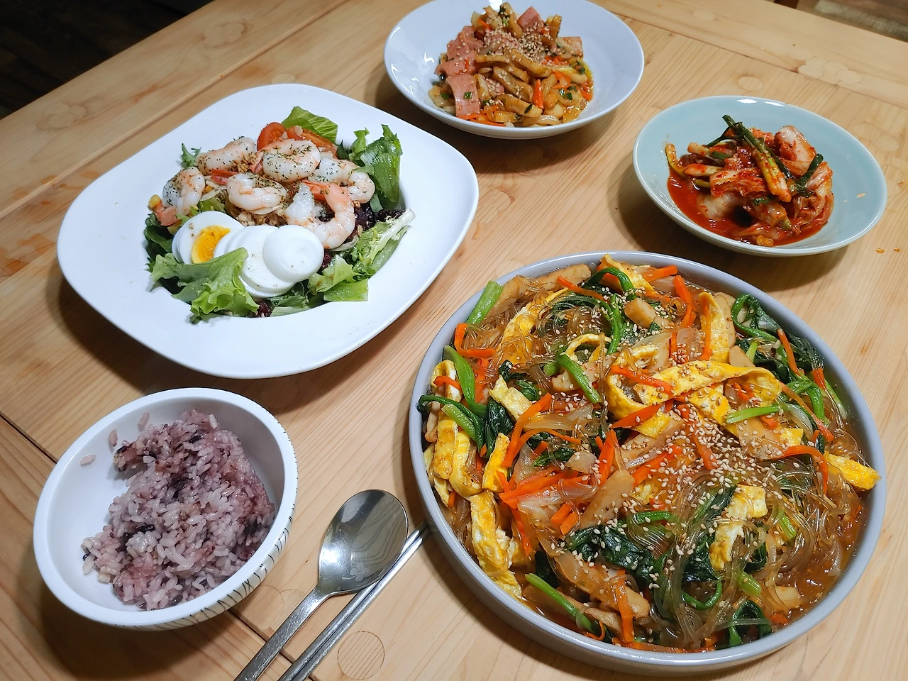 어제 다이어트 선언했고 강성옥 씨는 오늘 아침에 다이어트 식단으로 차려줬다. 초록색이 많은 샐러드에 초록색이 많은 잡채로다가.