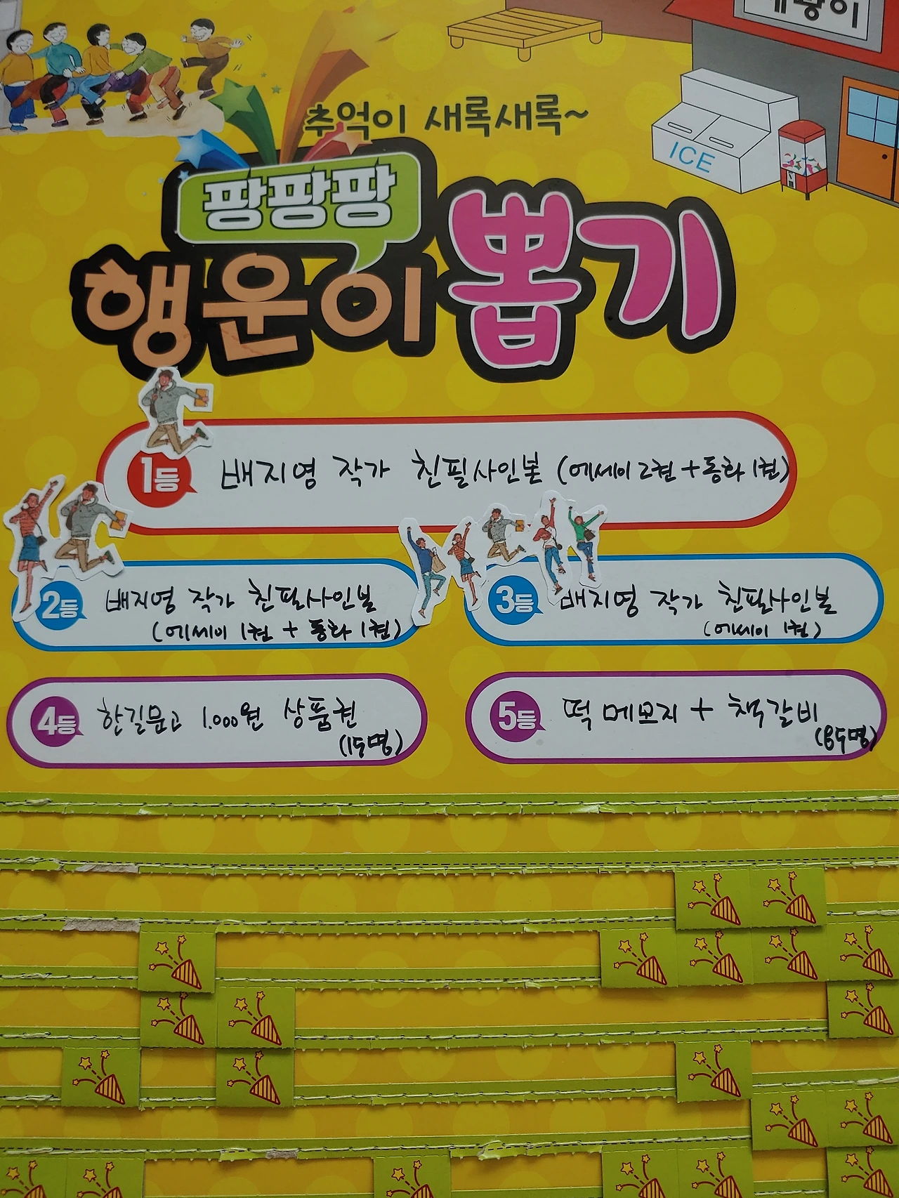 만화 <흔한 남매> <마법천자문> 구입한 어린이 독자들에게도 내가 준비한 ‘꽝 없는 뽑기’를 하라고 했다. 귀여워서 두 번씩 기회 주고서는 10초도 안 되어서 ‘1등 나오면 어쩌지?’ 괴로워했다. 오, 예!!! 하느님 부처님 고맙습니다. 1등(1명), 2등(2명), 3등(5명)은 내 책 구입한 분들이 뽑혔다. 행운을 거머쥔 것처럼 나도 막 환호했다. 히히. 이거 해서 뭐하긴? 재밌잖아.
