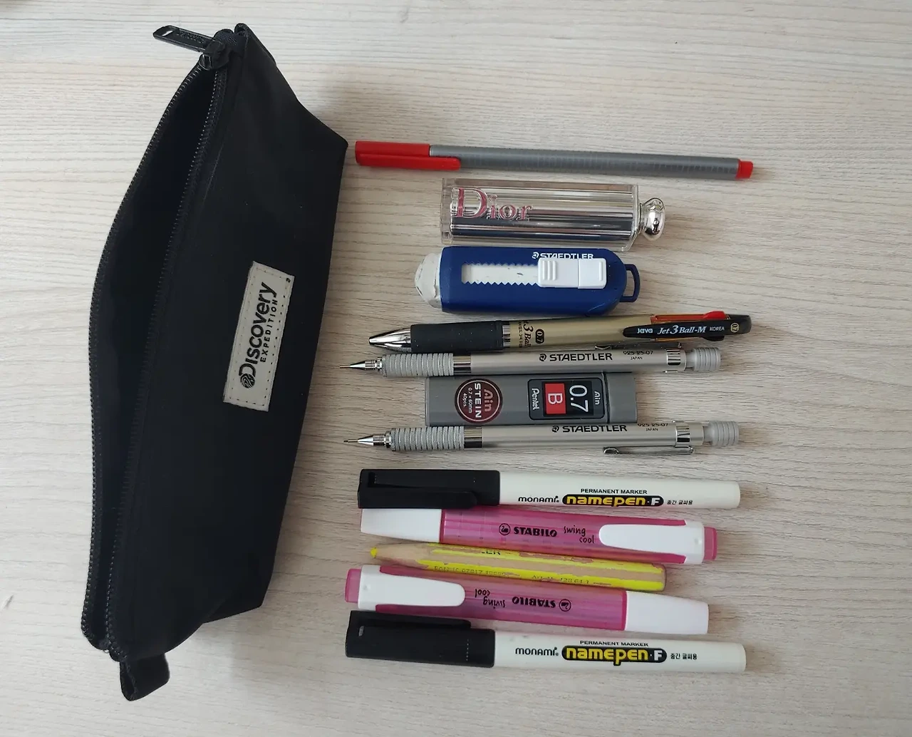 책을 다 읽고 내 필통(작년 3월에 둘째아드님이 안 쓴다고 버림)에 들어있는 거를 사진으로 찍어봤다. 나는 ‘샤프 두 개 병’이 있다. 어릴 때부터 앓던 불치병이다. 그밖의 필기구도 자꾸 잃어버려서 두세 달에 한 번씩 똑같은 걸로 다시 사곤 했는데 이번에는 오래 간다. 나도 많이 야무져졌다. 이게 다 <깊은 밤 필통 안에서>를 읽은 덕분이다.