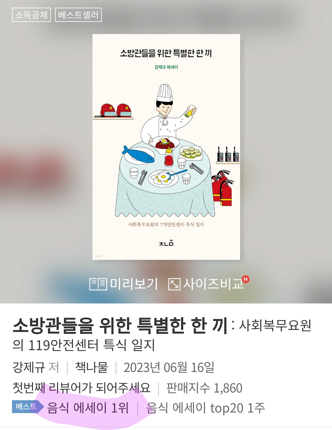 오늘 <소방관들을 위한 특별한 한 끼>가 ‘예스24’에서 음식 에세이 1위를 했습니다.