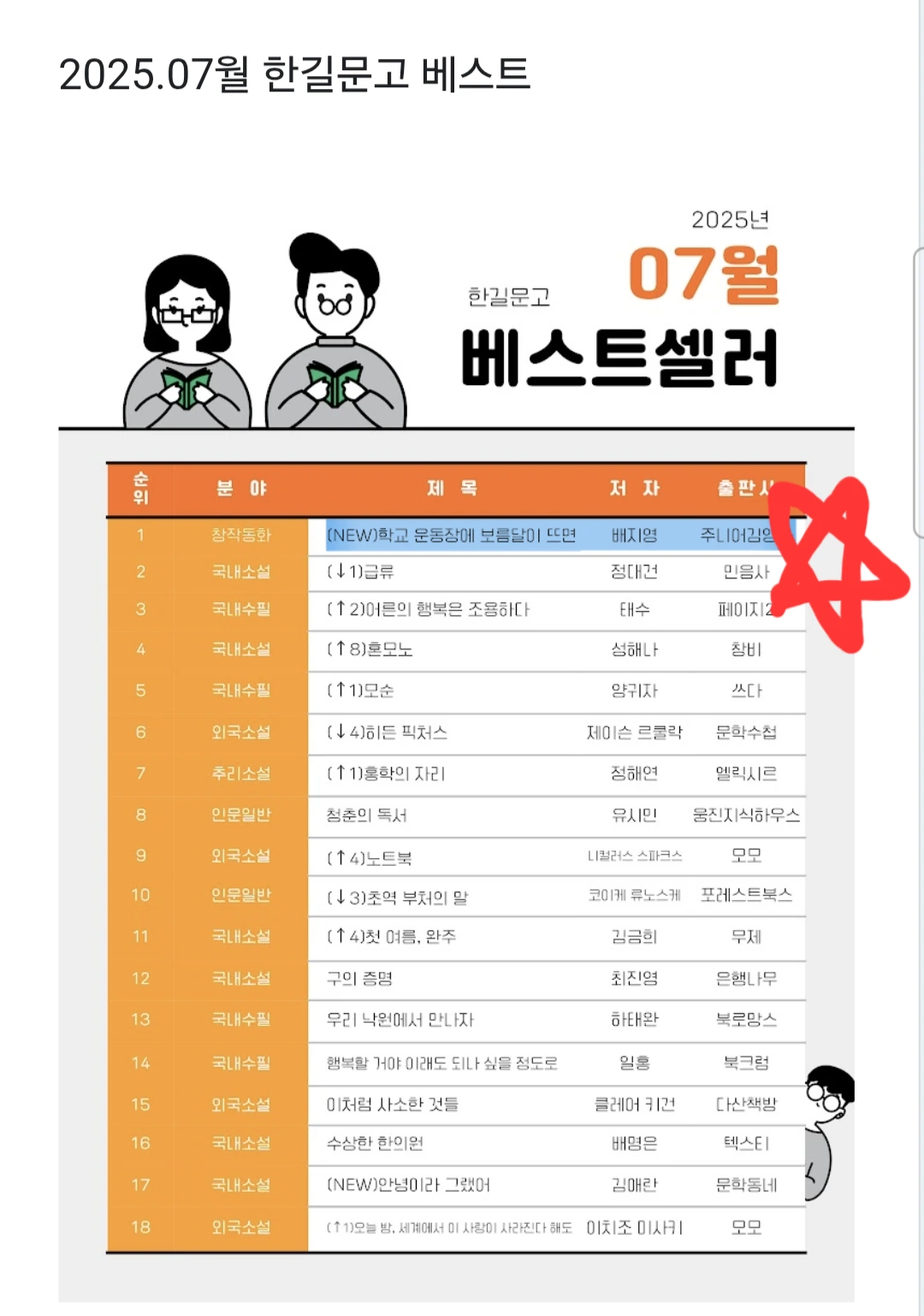 <학교 운동장에 보름달이 뜨면>이 한길문고 7월 베셀 1위 했어요. 군산 독자님들에게도, 멀리서 택배로 주문하신 독자님들에게도 감사드려요. 저는 이 소식을 일주일 전쯤에 알았어요. 겸손이 몸에 배어 있고(어?) 자랑 안 좋아하는 편이라서(뭐?) 이제야 뒤늦게.ㅋㅋㅋㅋㅋㅋ
