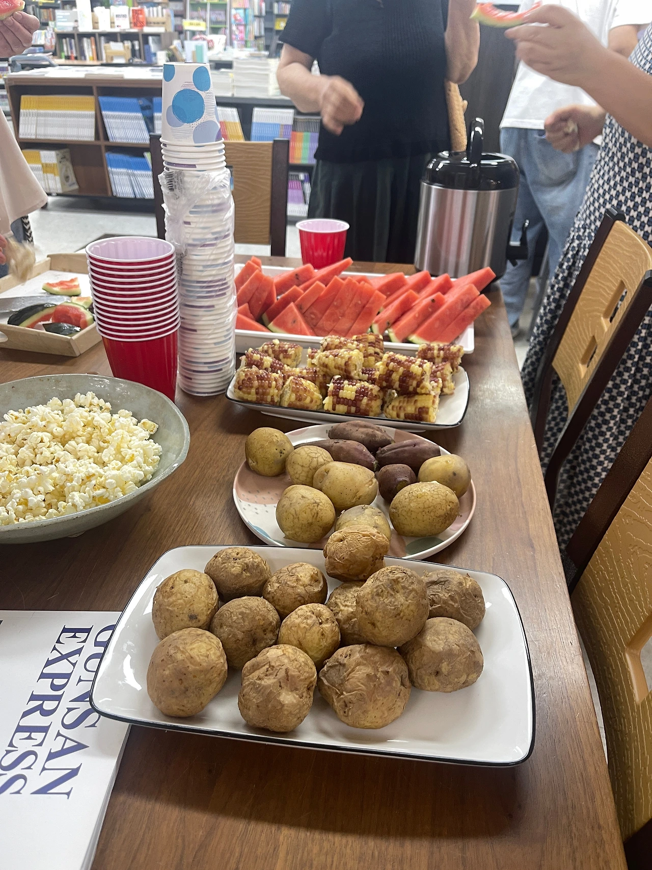 문지영 사장님은 일 마치고 온 선생님들이 허기지지 않게 감자, 옥수수, 수박 등을 준비해 주셨어요. 76세에 한길문고에 찾아와서 글을 쓰고 책을 펴내며 82세가 된 이숙자 선생님이 젊은 선생님들을 안아주는 모습도 참 아름다웠어요. 강연에 세트 메뉴처럼 붙어있는 노쇼. 그날은 100퍼센트 완벽한 출석이었습니다. 신청 안 하신 분들도 오셨고요.