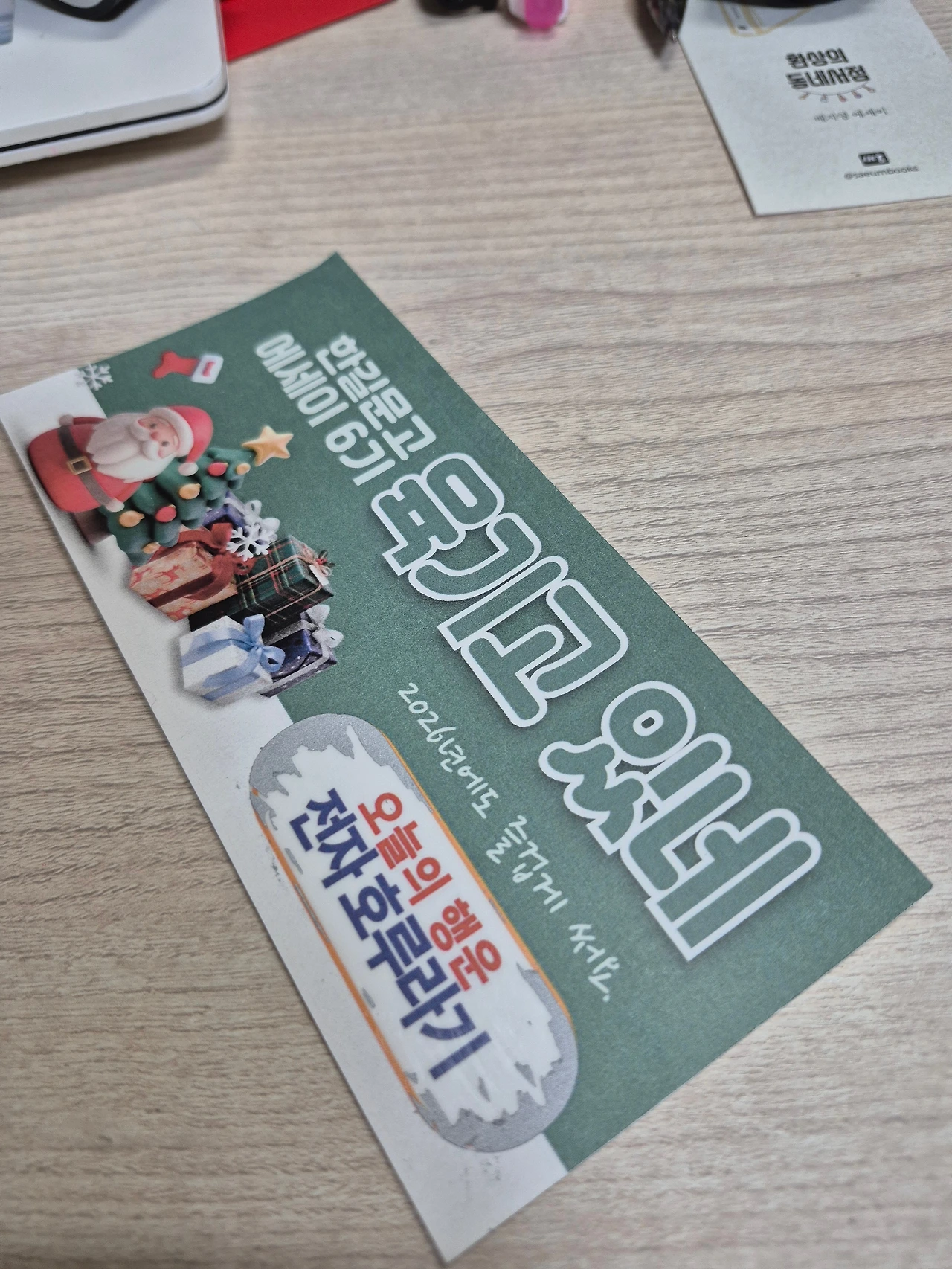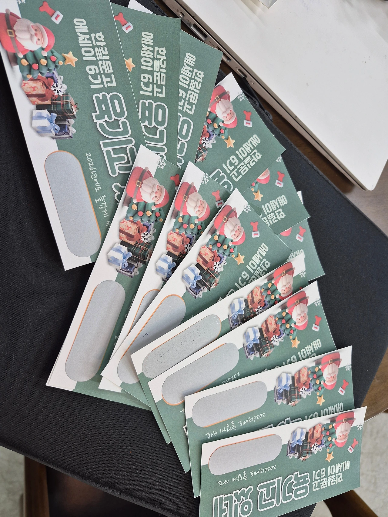 즉석 복권 때매 그래요. 제가 작년에 서점에서 모임을 여러 개 만드는 바람에 송년회도 아주 여러 번 했어요. 회원이 열 명에서 열다섯 명 사이일 때는 선물을 한 가지씩 준비해 오라 했고요. 랜덤 선물 뽑기. 저만 살짝 회원들에게 선물 목록을 받아서 즉석 복권으로 만들어 갔어요. 다들 너무 신나 했습니다.