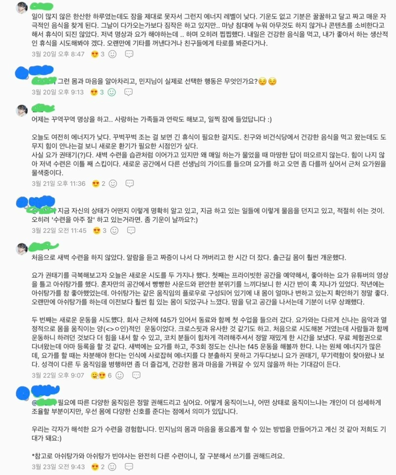 연애를 할 때도, 권태감이 찾아오면 새로운 시도를 하거나 소중한 순간을 다시금 상기해 보라고 한다. 나 역시 요가를 하며 기록한 글들을 다시 읽어보고, 평소와 다른 움직임을 시도해 봤다.