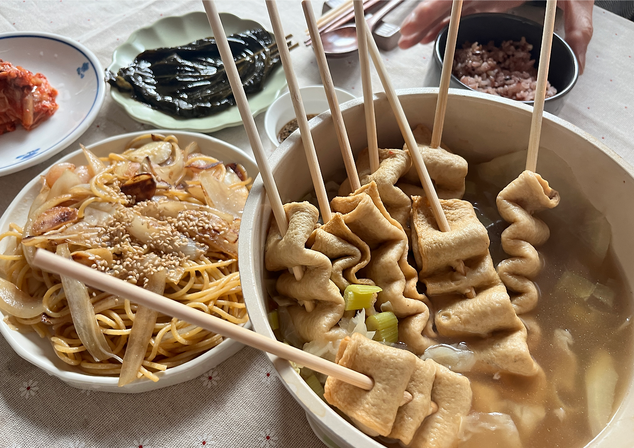이 집에 살면서 동거인과 집밥을 정말 잘해 먹는다. “나 이렇게 건강하게 잘해 먹고살아~”라고 아빠한테 보여주고 싶었던지라 계획에 없던 요리를 시작했다. 집에 있는 채소와 재료들을 꺼내 어묵탕을 끓이고, 오일파스타를 만들었다. 휘뚜루마뚜루 만들었지만 그릇에 담고 보니 그럴듯했다.