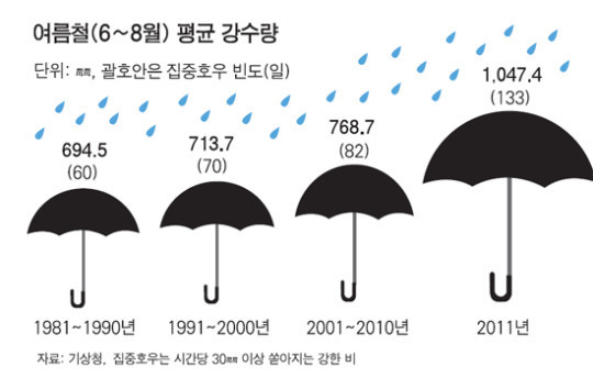 우리나라의 장마는 대개 7 ~ 8월 기간 중에 철을 맞았었다. 그러나 그런 통계는 근래 들어 잘 맞아떨어지지 않는 것 같다. 환경오염의 결과가 온통 이상 기온을 유발하며 제철도 아닌 때에 한곳에 집중적으로 비를 쏟아 ‘국지성 호우’니 ‘게릴라성 폭우’니 하는 말들이 낯설지 않고, 추수 때가 되어 폭우를 쏟기도 한다.
