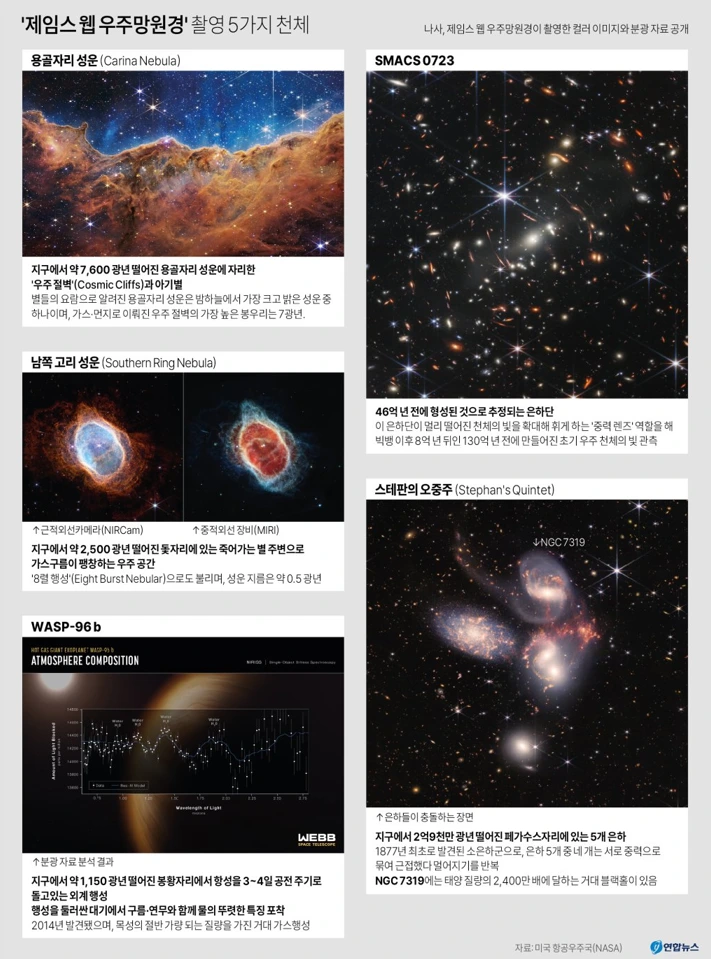 미국 항공우주국(NASA)이 우주를 가장 멀리, 가장 깊이 들여다보도록 설계된 제임스 웹 우주망원경(JWST)의 본격적인 과학 관측을 앞두고 공개한 ′첫 빛′(first light)의 이미지들은 우주 관측 역사상 가장 깊은 우주를 포착하고 별이 생성되고 소멸하는 장면은 물론 은하가 중력에 묶여 움직이는 모습을 네 장의 이미지에 단적으로 담아냈다는 보도였다.