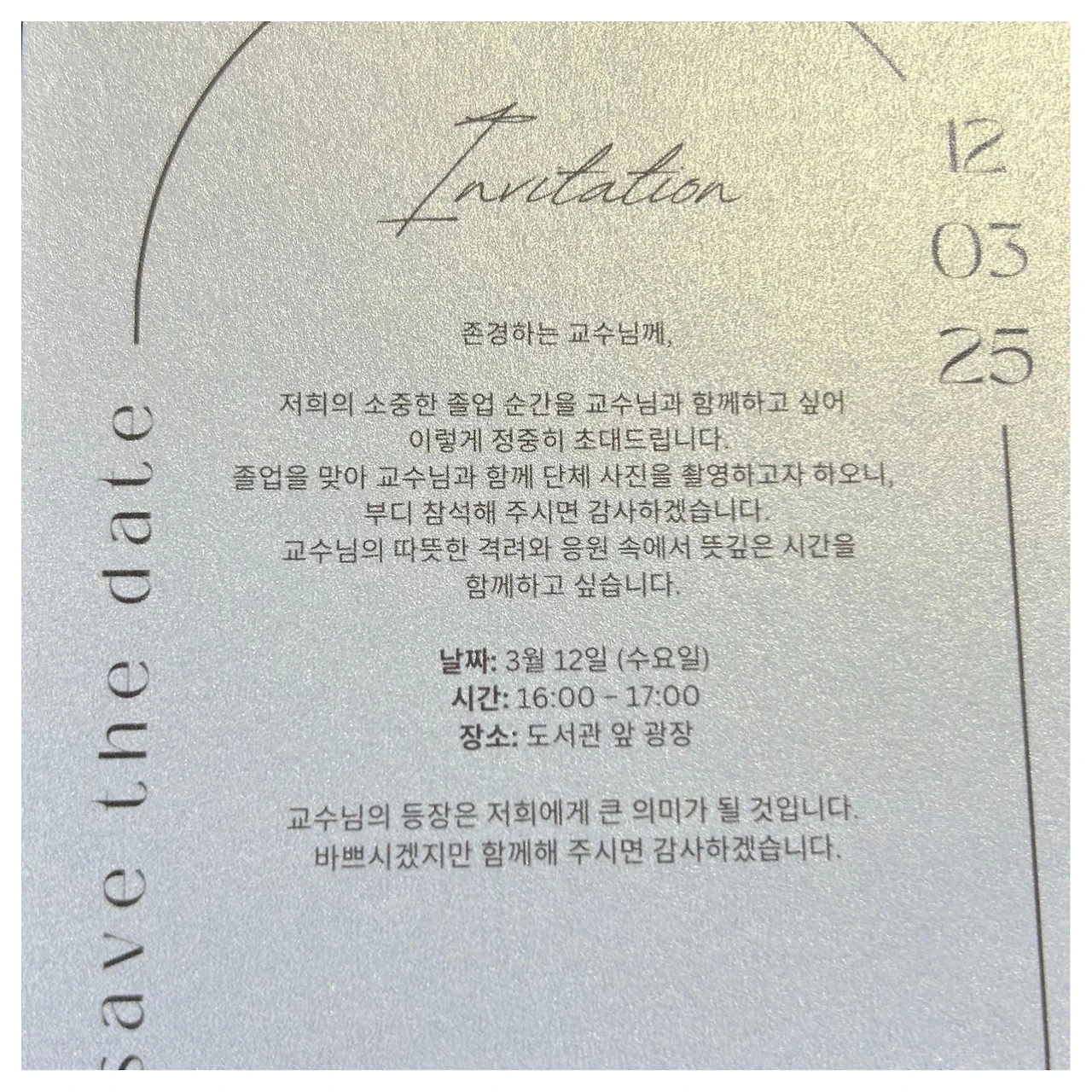 어느 날 메시지를 한 통 받았다. 4학년 학생들이 졸업 사진을 찍는데 와 줄 수 있냐는 말이었다. 연이어 다른 반에서는 인쇄된 초청장까지 받았다.