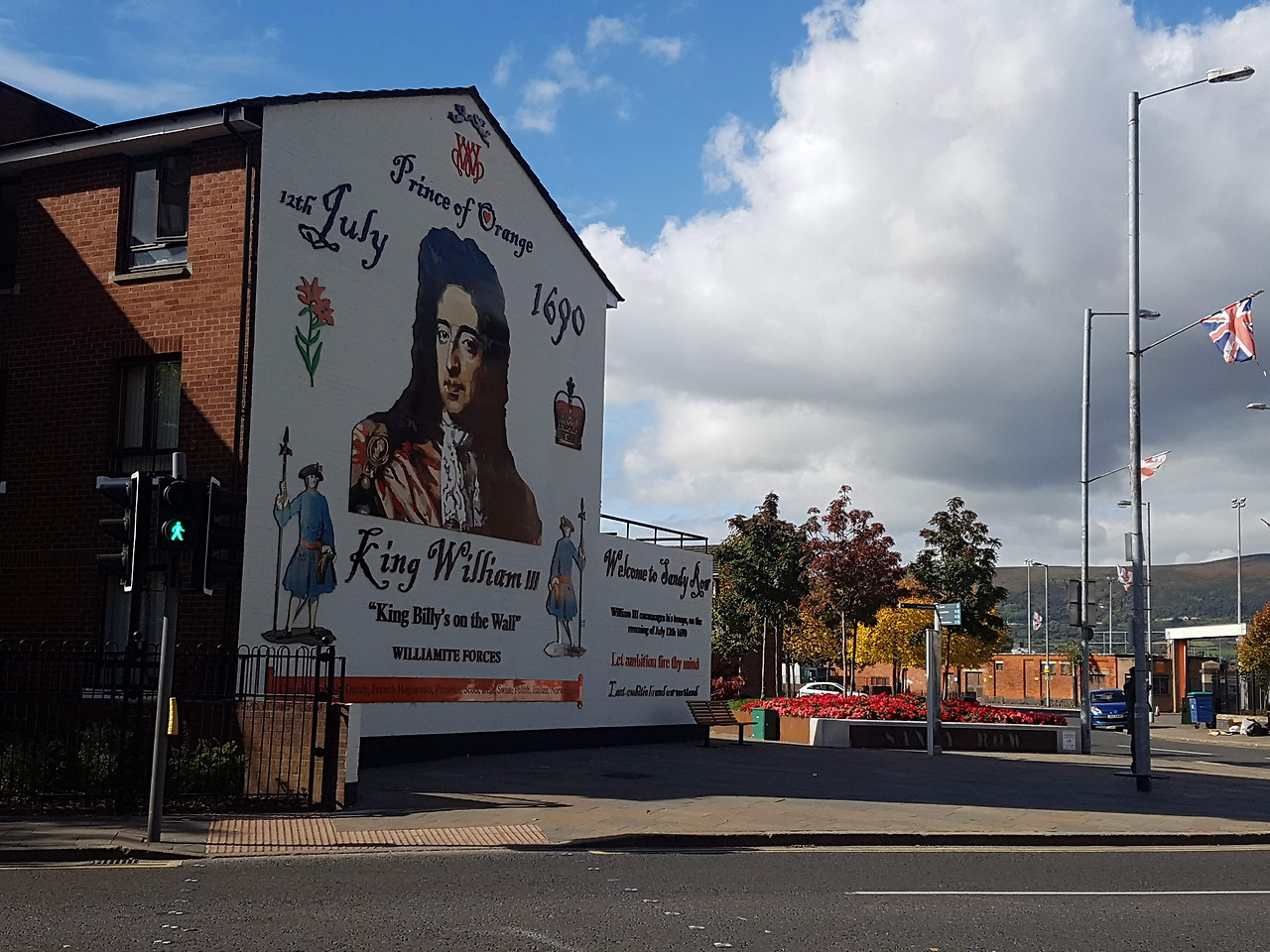 같은 날 벨파스트 내 다른 곳에서 촬영한 사진. 영국 국기와 오렌지공 윌리엄 3세는 개신교 커뮤니티의 정체성을 드러낸다.
