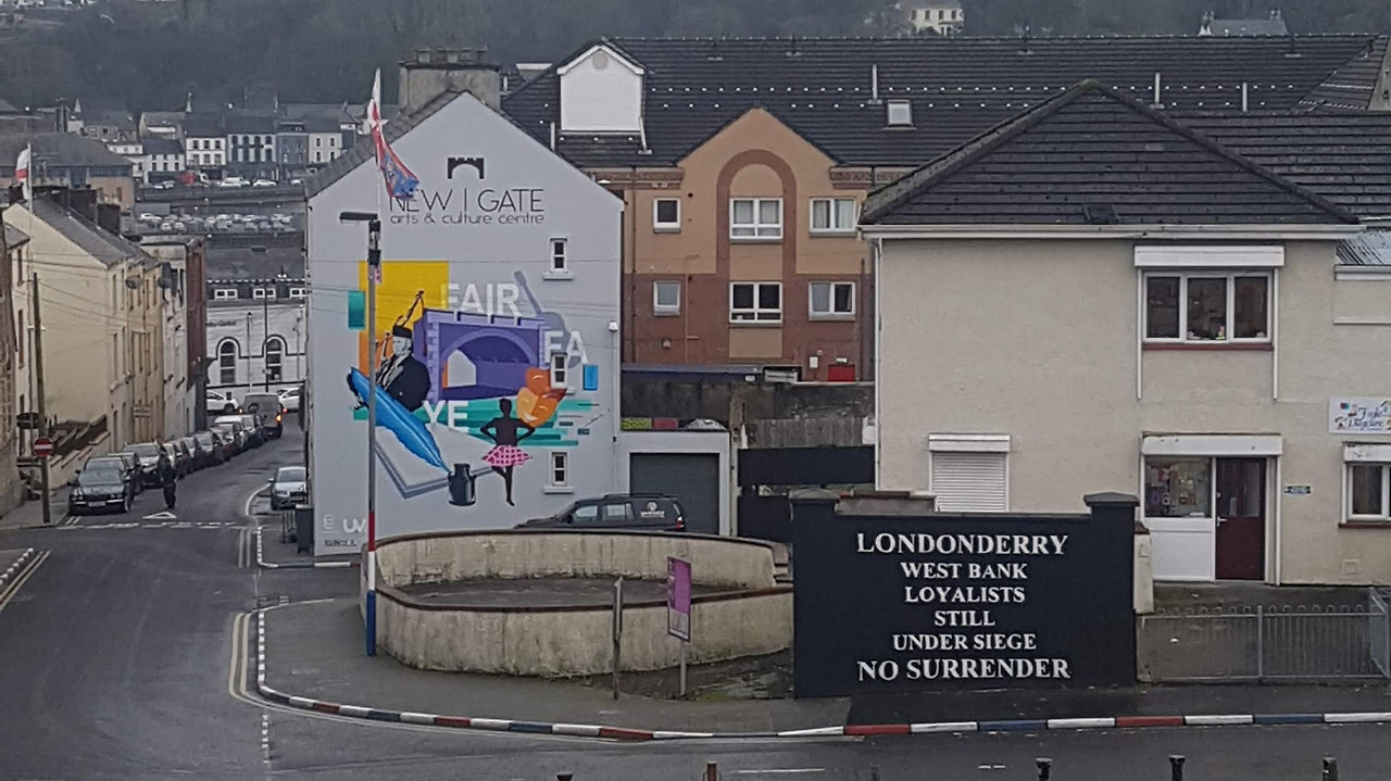 바리케이드를 넘어선 친구들. 데리/런던데리 지역은 북아일랜드 내에서도 갈등이 심각했던 곳 중 하나이다.