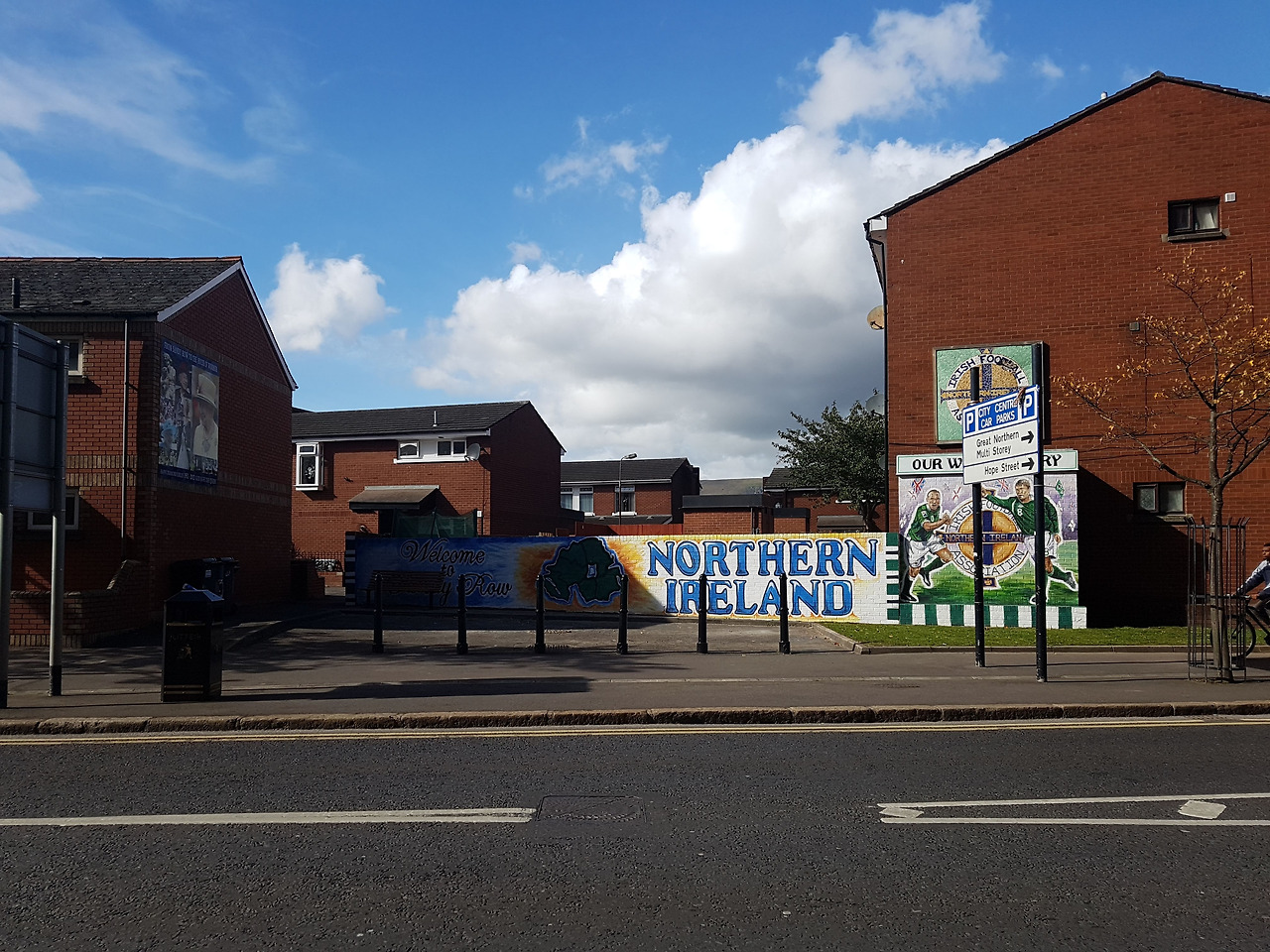 북아일랜드에는 마을의 정체성을 드러내는 그림들이 많다. 초록색으로 그려진 아이리쉬 풋볼은 가톨릭 계의 정체성을 드러낸다.