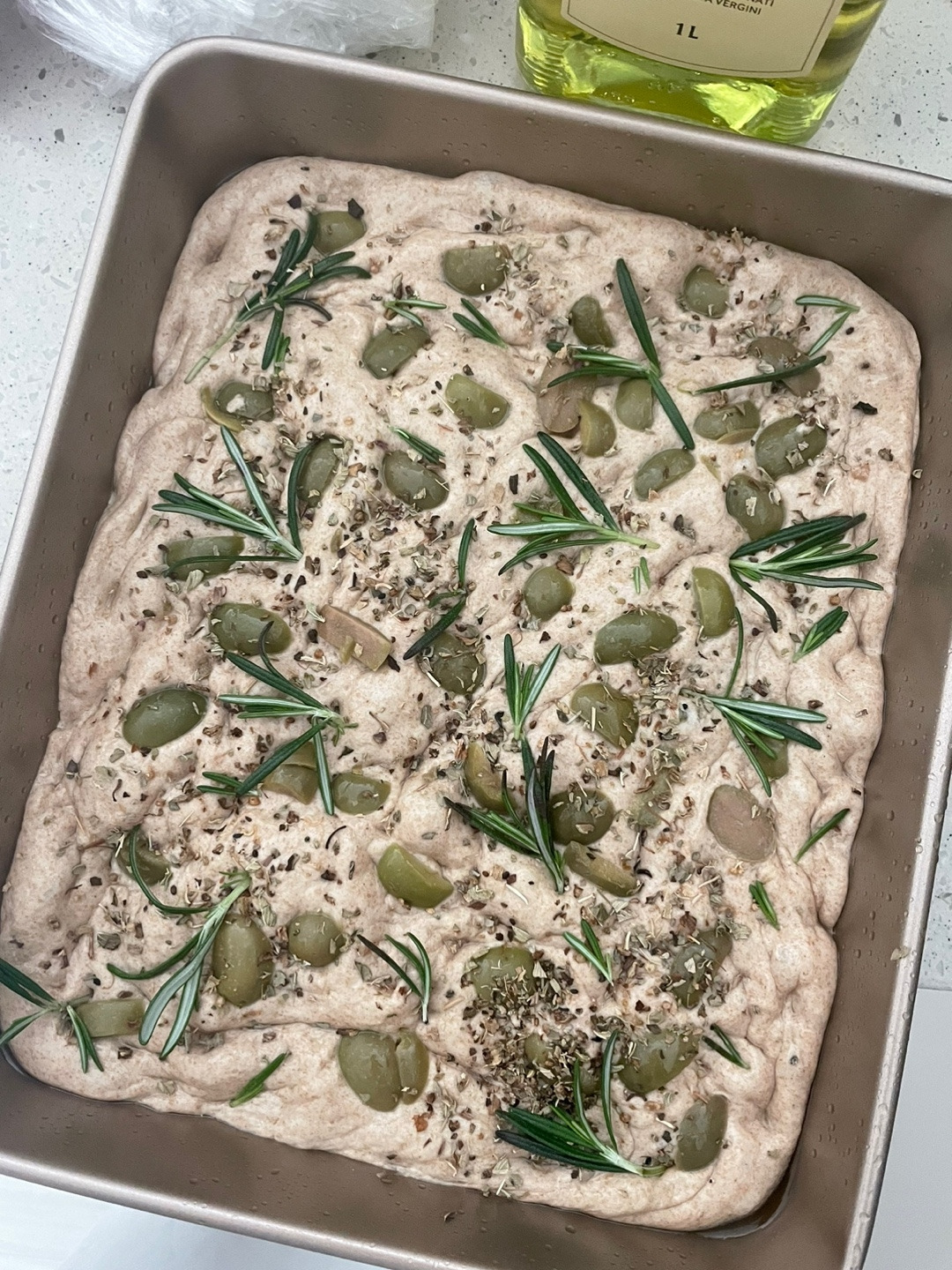 그런대로 남아있는 그린 올리브 씨를 발라 반죽에 놓아 빠지지 않게 한 번씩 꾹 눌러주고 로즈마리도 똑똑 잎을 끊어 고이 반죽 위에 놓아준다. 바질을 살랑살랑 흩뿌려주다가 훅- 쏟았지만 어찌 됐든 오븐에 들어갈 준비는 완료.