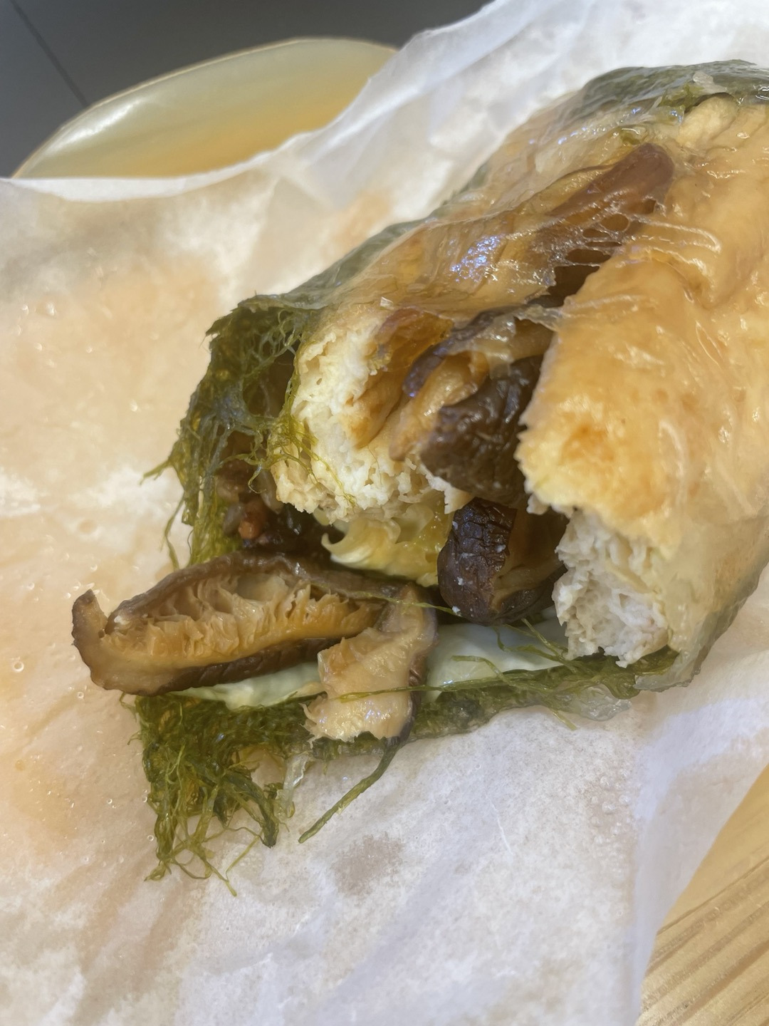 두부와 버섯을 간장과 맛술, 설탕으로 살짝 조려 본다. 위에 내어주셨던 간장을 따로 도시락으로 싸가긴 번거로우니 아예 속재료를 조금 짭짤하고 달달하게 간장으로 조려 내려는 심산이었다. 먹었던 주먹밥은 김으로 감쌌지만 집에 김은 없었던지라 남아있던 감태로 고급지게 말아보았다. 말다가 쌈을 몇 번 터트린다. 이 똥손은 도통 예쁘게 만들지 못한다. 어쩜 저렇게 예쁘게 말아내셨을꼬? 나는 죽어도 레스토랑이나 식당은 못하겠다. 디스플레이는 정말 나와는 먼 이야기 같다. 욕심을 내면 옆구리가 계속 터져나간다는 사실을 깨닫고 다시 조신히 적정량만 취해 말아내 본다. 음. 나쁘지 않아.