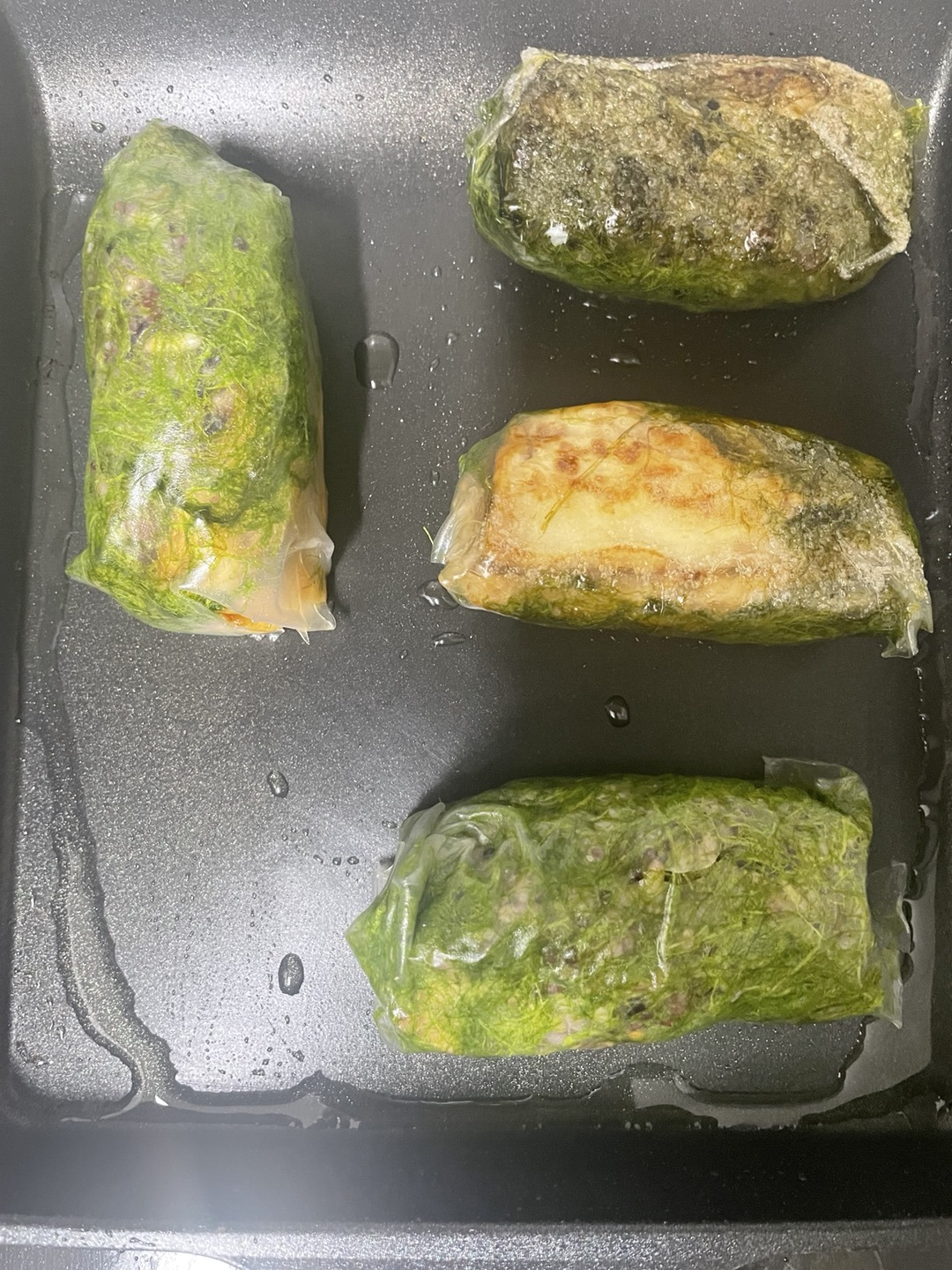 그리고 말아낸 주먹밥들은 바로 프라이팬으로 보낸다. 기름을 바르고 예열한 팬에 두면 잘 붙지 않으니 만들면 바로 프라이팬으로 직행시켜 약한 불에 천천히 구워낸다. 약한 불에 구워도 월남쌈은 잘 구워지는 편이다. 만약 굽지 않고 완성했더라면 다음날 점심, 이리저리 붙어 떨어져 나가는 월남쌈을 아주 더러운 모습으로 먹을 뻔했다. 다 구워진 월남쌈을 도시락 통에 차곡차곡 담아내면 끝. 이 얼마나 간단한지! 요리라고 할 수도 없다. 밥 반공기 양으로 빵빵한 월남쌈 주먹밥을 4개 정도 만들어낼 수 있고 먹을 때도 깔끔하고 간단하게 먹을 수 있다. 충분한 한 끼 식사가 되고도 남을 정도로 든든해 나의 단골 도시락 메뉴가 되었다.