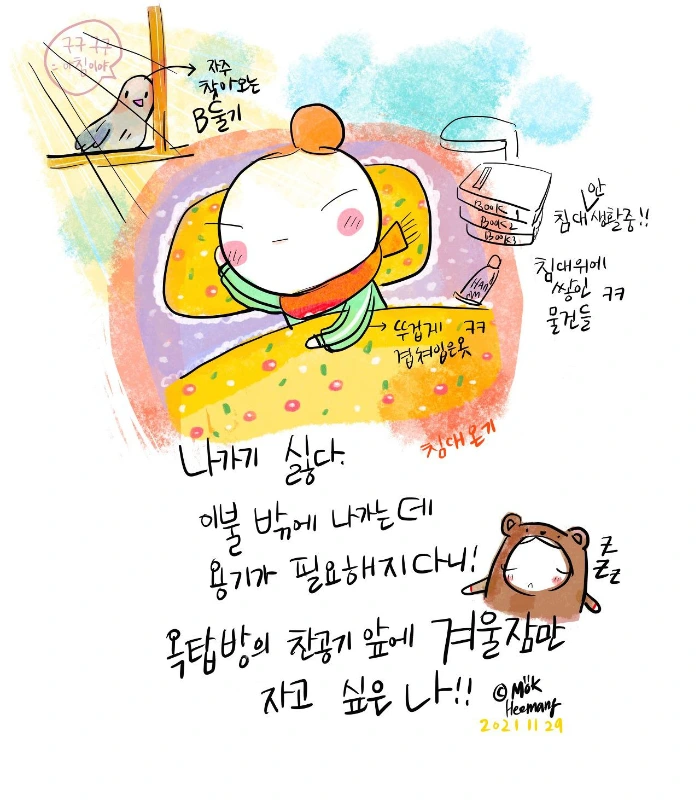 꿈쩍 안 하고 침대 주변의 온기를 누리며