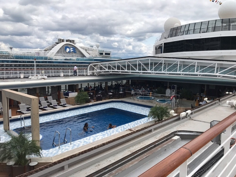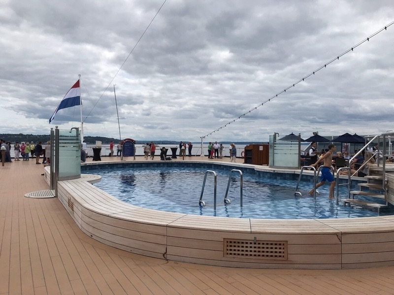 9층 선미에 옥외 씨뷰 풀(Sea-view Pool)이 있다. 펄럭이는 깃발은 네덜란드 국기이다. 이 배는 네덜란드 국적 배이며, 이 덩치 큰 녀석의 이름은 유로담(Eurodam)이다. 2008에 건조된 배이고 최근에 내부 리모델링을 한듯하며 2000명 정도의 승객을 태우는 대규모 크루즈선이다. 우리는 유로담과 함께 7일간 알래스카를 다녀오게 된다. 멋지다. 9층 투어는 계속된다. 배 중앙 부분에는 풀이 또 하나 있다. 아이들 사용 가능 수영장인지라 꽤나 소란스럽다. 지붕이 개폐식이라 닫히면 실내수영장이 된다. 비가 오나 눈이 오나 사용 가능하다. 여기가 9층의 중앙광장 쯤된다.
