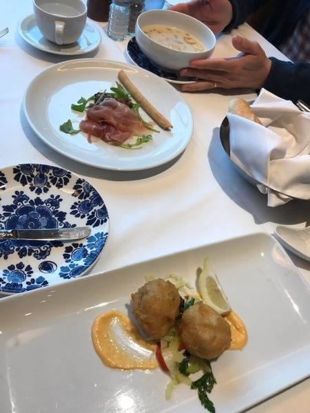 저녁식사는 3층에 있는 '더 다이닝룸'이라는 레스토랑에 늦은 시간 8시 예약을 하고 먹었다. 예약 베이스의 식당 더 다이닝 룸은 웨이터들의 서비스를 받는 파인 다이닝 레스토랑이다. 식사는 스타터부터 메인 요리, 그리고 디저트까지 코스로 제공된다. 각 코스별 3~4개의 요리가 준비되어 있어 취향에 맞게 선택하면 된다. 우리는 모두 다른 메뉴를 주문해서 골고루 먹어보는 것을 즐긴다. 번잡스러운 뷔페보다는 이곳이 조용히 식사하는 것이 더 좋다. 앞으로 디너는 여기서 하는 것으로 결정한다. 매일 메뉴가 바뀌므로 아주 '땡큐'다.