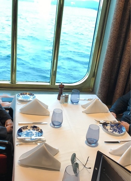 식사하는 동안 창 밖은 바다가 넘실거린다. 이 식당에는 드레스 코드가 있다. 되도록이면 점잖게 하고 오면 좋다. 캐주얼 정장부터 턱시도까지 스타일의 스펙트럼이 넓다. 반바지에 슬리퍼나 방금 조깅에서 돌아온 듯한 복장만 아니면 된다. 점쟎게 열심히 맛있게 디너 정찬을 즐기고 나니 늦은 밤이다. 일찍부터 서둘러 움직인 터라 피곤하다. 방으로 돌아와 눕자마자 여정 첫날이 지난다.