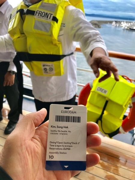 식사 후 오후 2시 쯤되니 비상훈련을 전체 승객 대상으로 실시한다. 모두가 3층 갑판에 모여 비상시 탑승할 구명정과 탑승장소를 확인한다. 우리는 어영부영 내려가 섰는데 우연의 일치로 우리의 비상시 집합지역인 10번 구역에 정확히 맞게 섰다. 그러고 보니 발급된 탑승카드에 어셈블리 스테이션 10번이라고 쓰여 있었네. 우리는 비상시 저 빨간 10번 배를 타야 하는 것으로 교육받는다. 노약자나 장애인 등 누구도 예외 없이 참여한 비상훈련이었고, 모두 모아놓고 보니 나이 드신 서양 어르신들이 대부분이었다. 휠체어를 타고 나온 시니어들도 많았다. 평균 연령 엄청 높다. 훈련이 끝나니 모두 해산한다. 웅성웅성 각자 방으로.