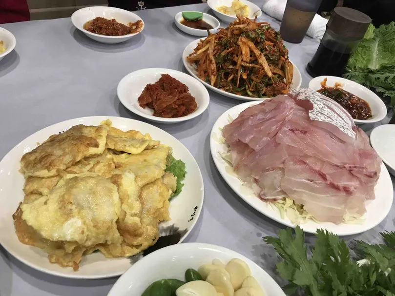 블루리본, 택시기사님 추천, 지인 추천 모두 등장한 명실공히 목포의 유명 스타 식당이다. 민어회 전문식당인데 역 앞 구도심 민어회 거리에 있다. 어느 항구도시에나 있을법한 골목에 딱 그런 분위기의 식당이다. 민어 코스를 주문하면 회, 무침, 전이 나오고 마지막으로 탕과 밥을 준다. 민어회를 본격적으로는 처음 먹어보는데 맛있다. 적당히 졸깃하고 부드럽다. 모든 음식의 양념들은 어찌 그리 적당한지 참 거시기하다. 매워 보이는데 안 매운 것은 도대체 무슨 마술일까 싶다. 택시기사님의 평에 의하면 이 집은 배가 불러서 조금 맛이 갔다는데, 외지인들에게는 이 정도도 감사한 남도의 맛이다.