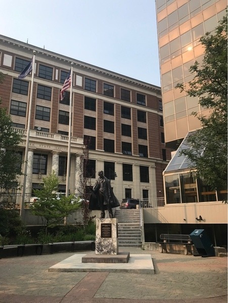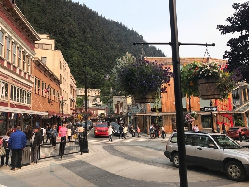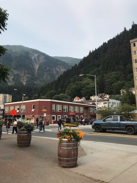 주노 항의 인상은 산토리니항 같았다. 깎아지른 절벽 바로 밑에 항구가 있어서 그랬나 보다. 소담하고 이쁜 미국의 시골 풍경이 펼쳐지는 곳이다. 번잡한 항구도시를 벗어나 언덕을 조금 올라가면 보이는 성조기가 펄럭이는 저곳이 알래스카 주정부 건물이다. 사진 왼쪽 누런 유리 건물은 주법원이다. 입구에 회색 대리석 기둥 4개가 인상적이었다. 입담 좋은 셔틀버스 운전사 아저씨의 너스레에 의하면 미국 주청사 중 가장 못생긴 청사라고 한다. 관광버스 기사님들의 입담 능력은 세계 공통인가 보다.