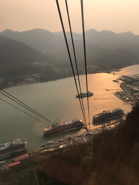 주노항에는 깎아지른 산을 오르는 케이블카가 있다. 30여 달러를 지불하고 오르면 주노항을 산 위에서 내려다볼 수 있다. 여기서 보면 엄청난 크기의 크루즈 선들도 장난감 배처럼 귀엽다. 전체적인 산세와 경관은 살짝~ 강원도 느낌이다. 산세가 둥그러서 그런 모양이다. 나무에 미국을 상징하는 흰머리 독수리들이 앉아있다. TV에서만 보다가 실제로 보니 신기하다. 정상에 올라가니 어김없이 기프트샵과 영상 상영이 있다. 국화빵 시스템! 원주민 인디언들의 역사와 문화에 대해 이야기한다.