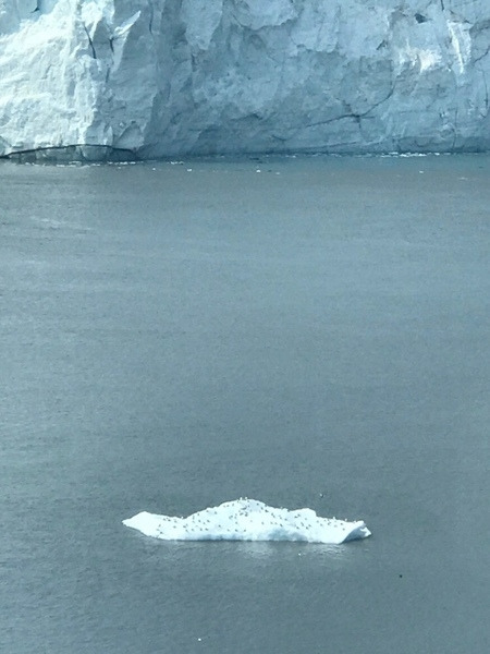 빙하를 만난 승객들은 갑판에 나와 있다. 조금이라도 더 가까이서 보고 싶고 유리를 통해서가 아닌 직접 눈과 마주치고 싶어서 나왔을 것이다. 나도 그랬으니까. 수면 위 유빙은 새들의 차지다. 나는 새들이 유빙에 모여 앉아 쉰다.
