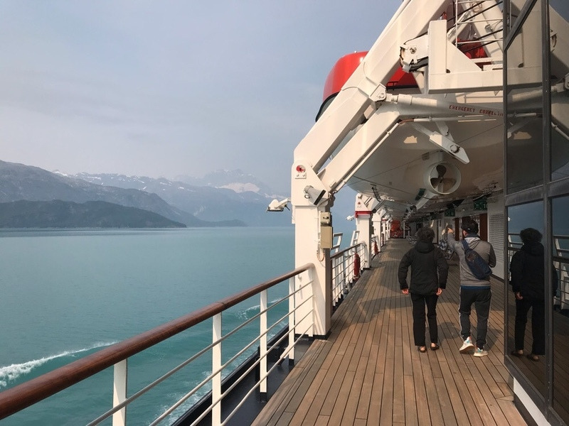 식사 후 프로모네이드(Promonade)라는 멋진 명칭으로 불리는 3층 데크로 가서 배 둘레 트랙을 워킹했다. 이 곳은 선내 가장자리를 한 바퀴 돌 수 있는 데크가 있다. 3바퀴 돌면 1마일 정도란다. 많은 사람들이 데크를 돈다. 바다를 보며 운동하는 기분이 삼삼하다. 나중에 사전 찾아 알게 된 사실인데 이 단어는 산책이라는 뜻도 가진 말이었다. 이제 슬슬 여름인데도 눈이 덮인 설산들이 보이기 시작한다.
