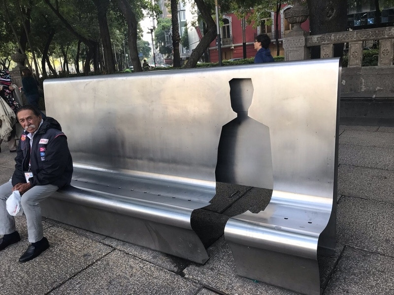 탑을 보러 차에서 내렸다가 발견한 재미있는 일상의 발견 두 가지가 있다. 하나는 젊은 커플의 낡은 차량 뒷부분인데 , 폭스바겐 엠블렘이 장난기 가득하게 귀여운 악마로 변신해 있었다. 두 번째는 그 폭스바겐 앞에 있던 벤치다. 한 사람 앉을 부분을 생략한 여유가 재미있다. 한 사람의 공간을 희생하고 재미를 부여했는데, 사실 공적인 시설인 벤치에 이런 호사로움을 부리기가 쉬운 일은 아니다. 역시 멕시코 클래스! 이런 예상치 않은 해프닝들이 낯선 곳에서 만나는 소소한 즐거움이다.