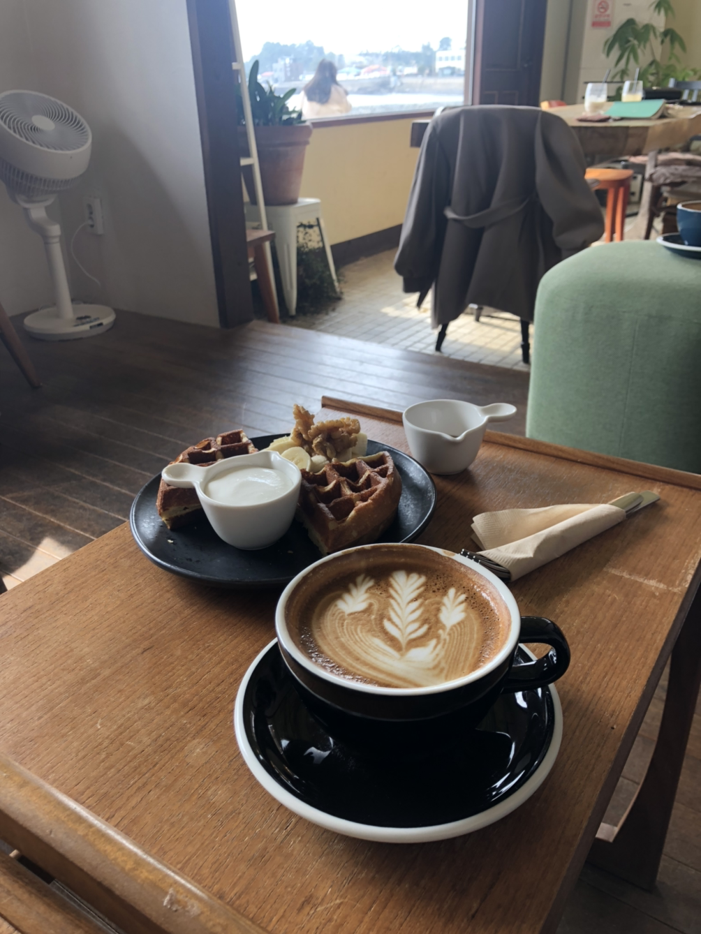 식사를 마치고 우리는 심각하게 커피가 고파졌다. 워낙 큰 해수욕장이라 별다방 같이 쉽게 눈에 띄는 대자본 카페들이 많다. 하지만 우리는 여기까지 와서 그런 곳을 갈 수 없다는 의지로 주변을 둘러본다. 환하게 보이는 빵 파는 카페가 있어 차를 세우고 가보니, 이곳은 마늘 바케트로 쥰 선다는 유명한 빵집이란다. B는 세상의 모든 맛 빵집을 아는 것 같다. 커피는 테이크 아웃하고 숙소로 출발한다.
