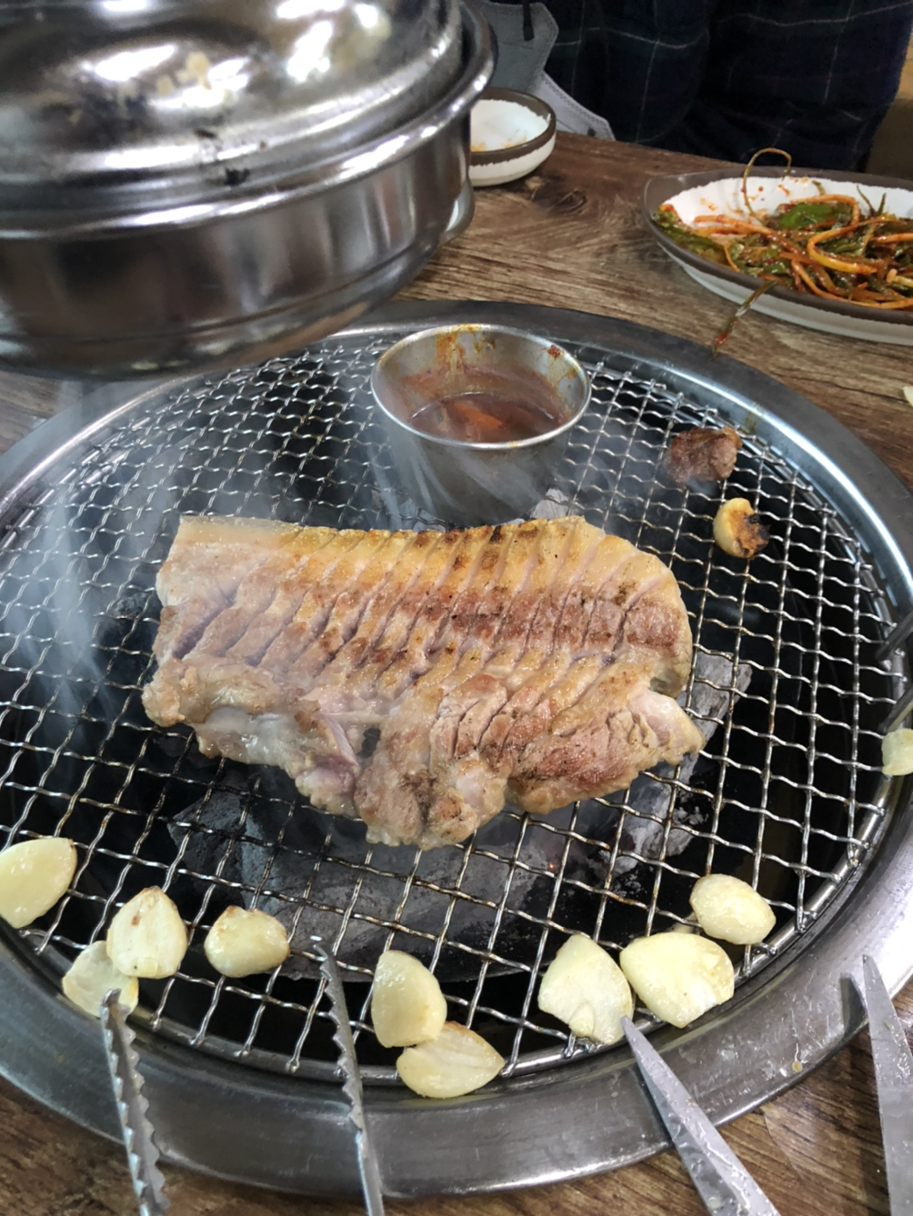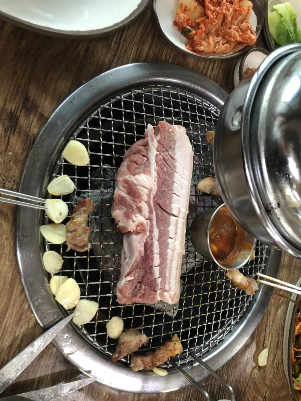 숯을 내오시는데 그 빛이 예사롭지 않다. 생고기는 싱싱하고 두텁다. 멜젓은 짜거나 자극적이지 않아 푹 찍어