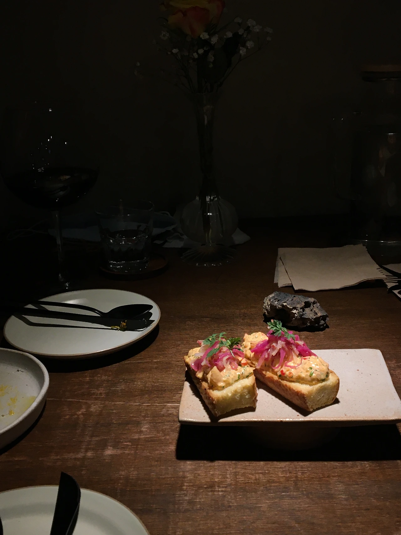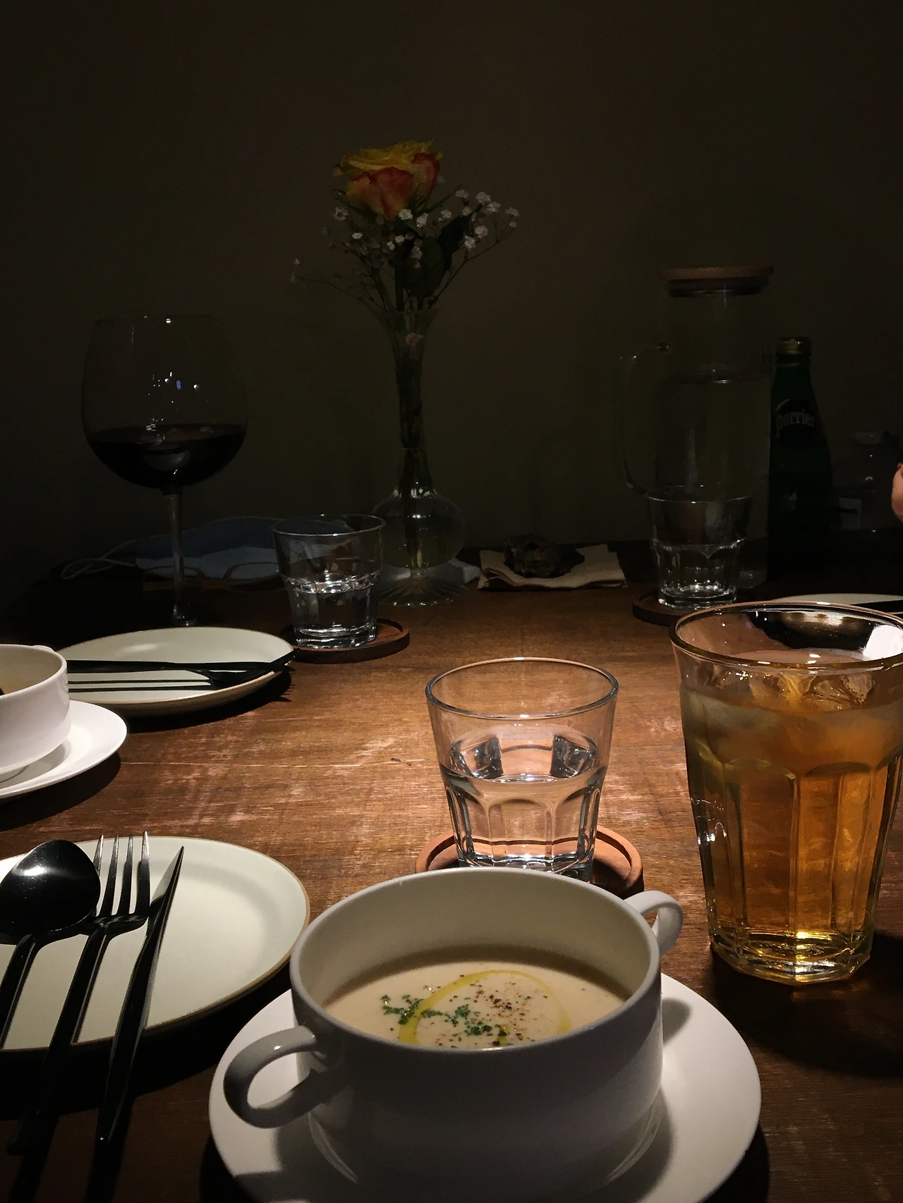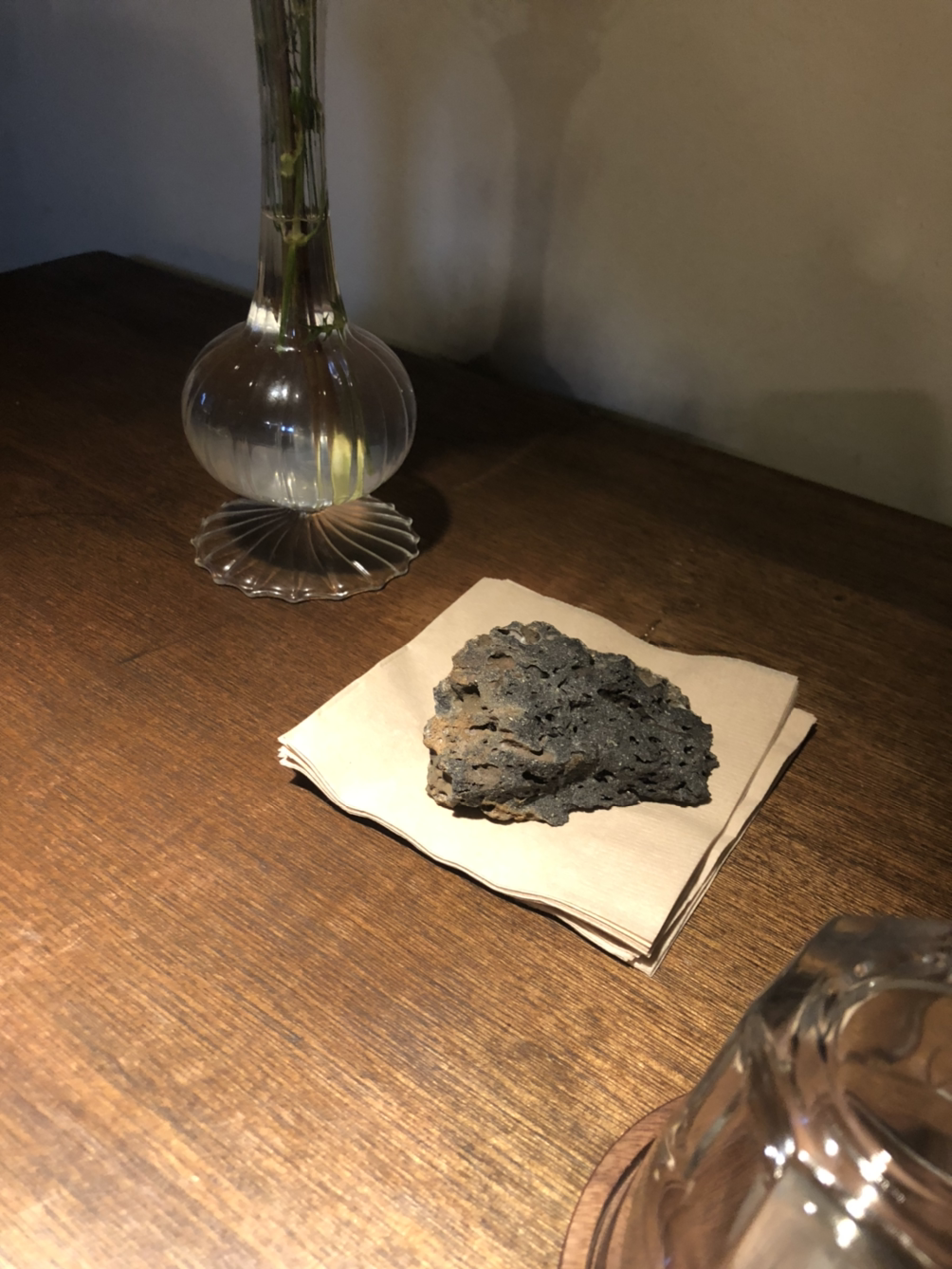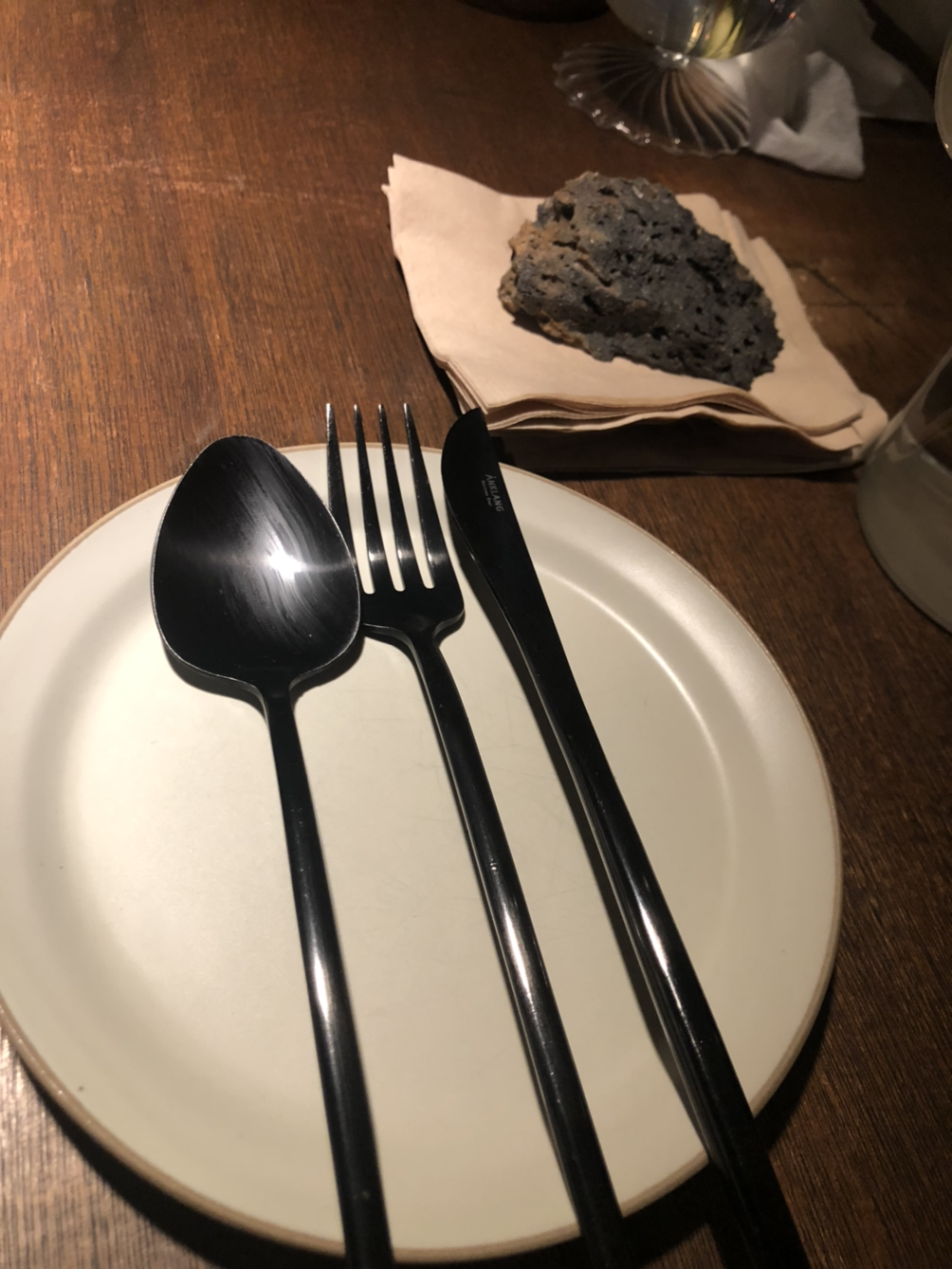테이블 세팅 디테일도 눈여겨 볼만하다. 처음엔 나이프와 포그가 플라스틱인 줄 알고 깜짝 놀랐다. 검은 도금이 되어 있었기 때문이다. 그러면 그렇지. 냅킨에 올려놓은 돌은 검은 제주 돌이다 작은 세팅 하나에도 자신들의 생각을 담으려고 노력한 흔적들이 보인다. 이런 거 참 좋다. 나이스! 젊은 비즈니스맨들~