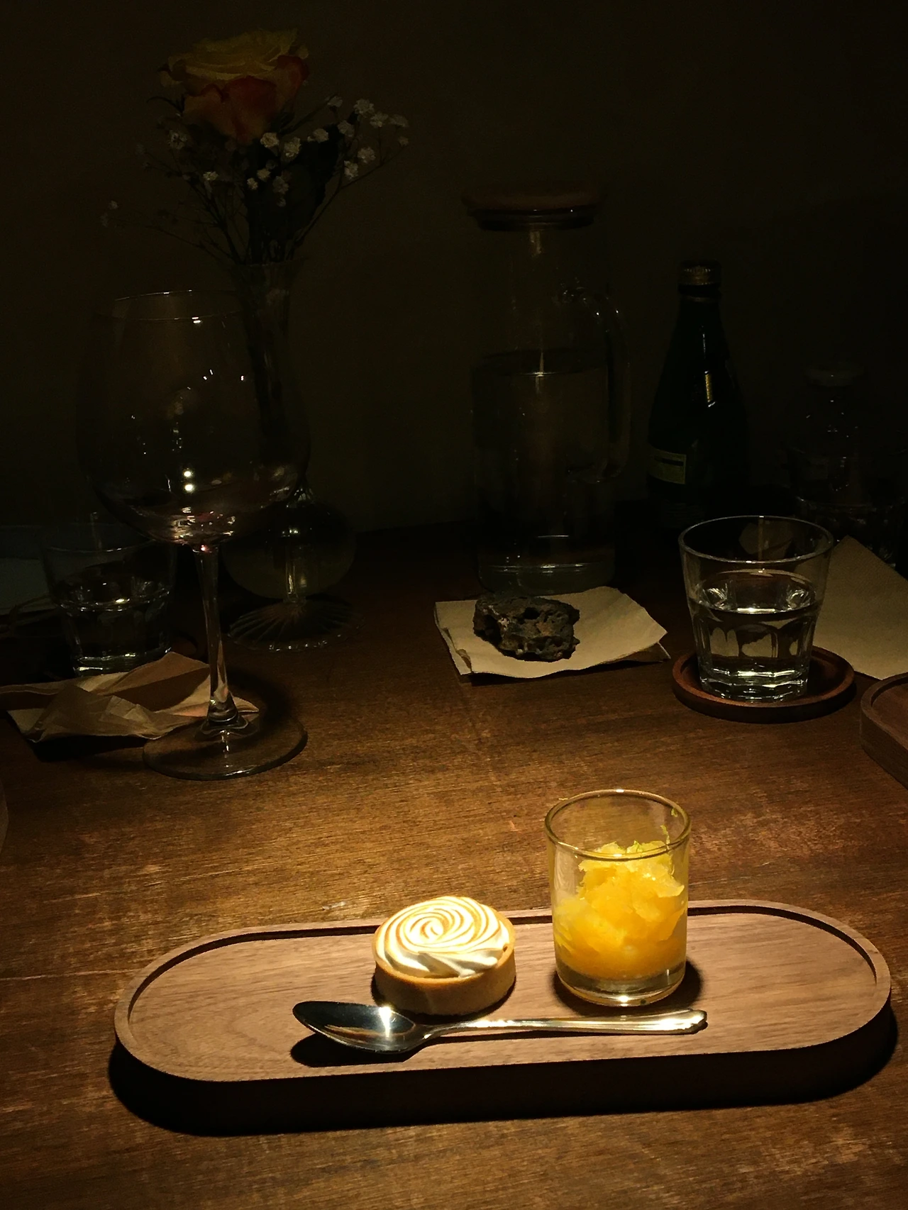 곧 문이 열리고 들어오라는 콜을 한다 밖 분위기는 팬시한 반면 인테리어는 굉장히 중후하다. 대체로 어둡게 하고 LED 조명을 잘 활용해서 분위기를 살렸다. 가운데 바 테이블을 셰프 주변으로 두르고 홀에는 테이블을 두 개만 놓인 시원하다.