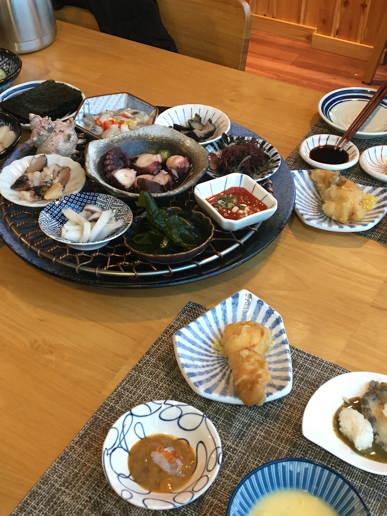 주방과 테이블의 거리가 좀 떨어져 있어 음식을 부지런히 가져다주신다. 도시 촌놈들이 오랜만에 바닷가에 앉아 싱싱한 해산물을 보고 먹으니 어찌 맛이 없겠는가. B는 왜래 하찌보다 특이한 생선을 많이 먹어보는 기회가 되었다고 한다.