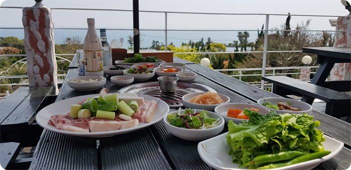 중문과 서귀포 사이 산토리니 느낌 나는 언덕에 자리 잡은 흑돼지구이 고깃집이다. 입구에 3대 물림 식당이라는 팻말이 있는데 덕분에 믿음 뿜뿜. 바다를 내려보며 흑돼지를 구워 먹노라면, 산토리니에서 고기 먹는 것 같은 착각이 든다. 정작 산토리니에서는 이런 호사를 못 누리지 않는가! 웟 어 굿 플레이스. B와 2017 섬머 제주행 때 어영부영 발견했다. 흑돼지 오겹살과 된장찌개 맛있다. 시원한 바람을 맞으며 바다를 내려 바라보는 운치가 맛을 잊게 할 정도로 뛰어나다.