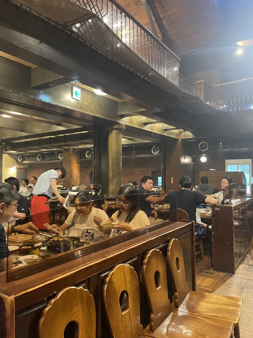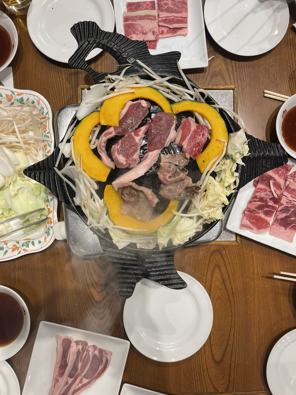 소고기 2, 양고기 1, 모둠 야채를 주문한다. 서빙 로봇이 음식을 가지고 온다. 브루스타에 달구어진 삐죽삐죽 튀어나온 모양 불판 위에 고기를 올려 구워 먹는다. 우리나라 고깃집과 매우 비슷하다. 맛도 그럭저럭 나쁘진 않지만, 공간이 주는 신선한 혜택을 빼면 우리나라 고깃집이 압승이다.
