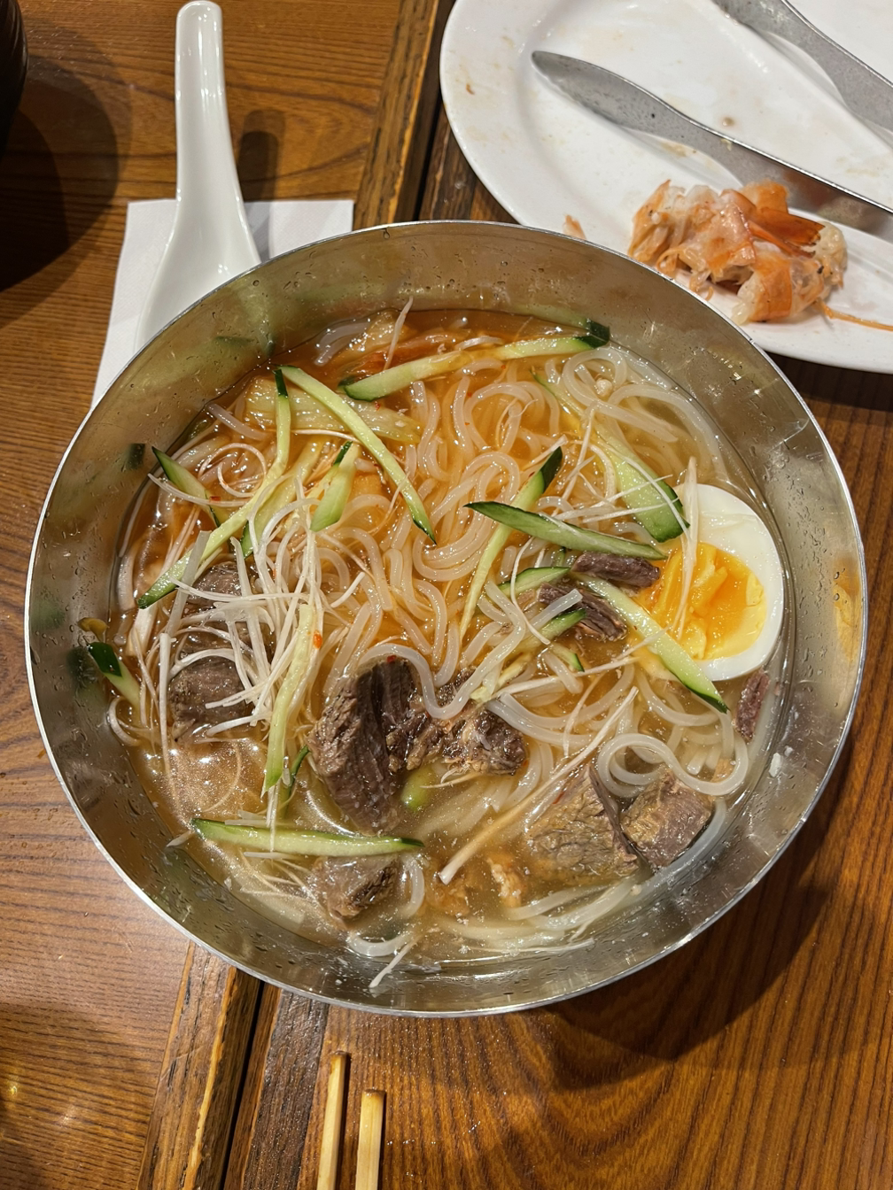 식사 도중 기본 허기를 채운 상태에서 메뉴판을 다시 보니, 반갑게 김치도 있고 냉면 (Korean style cold noodle)도 있다. 한국문화가 어디 가나 대세다. 잇츠 국뽕 타임.