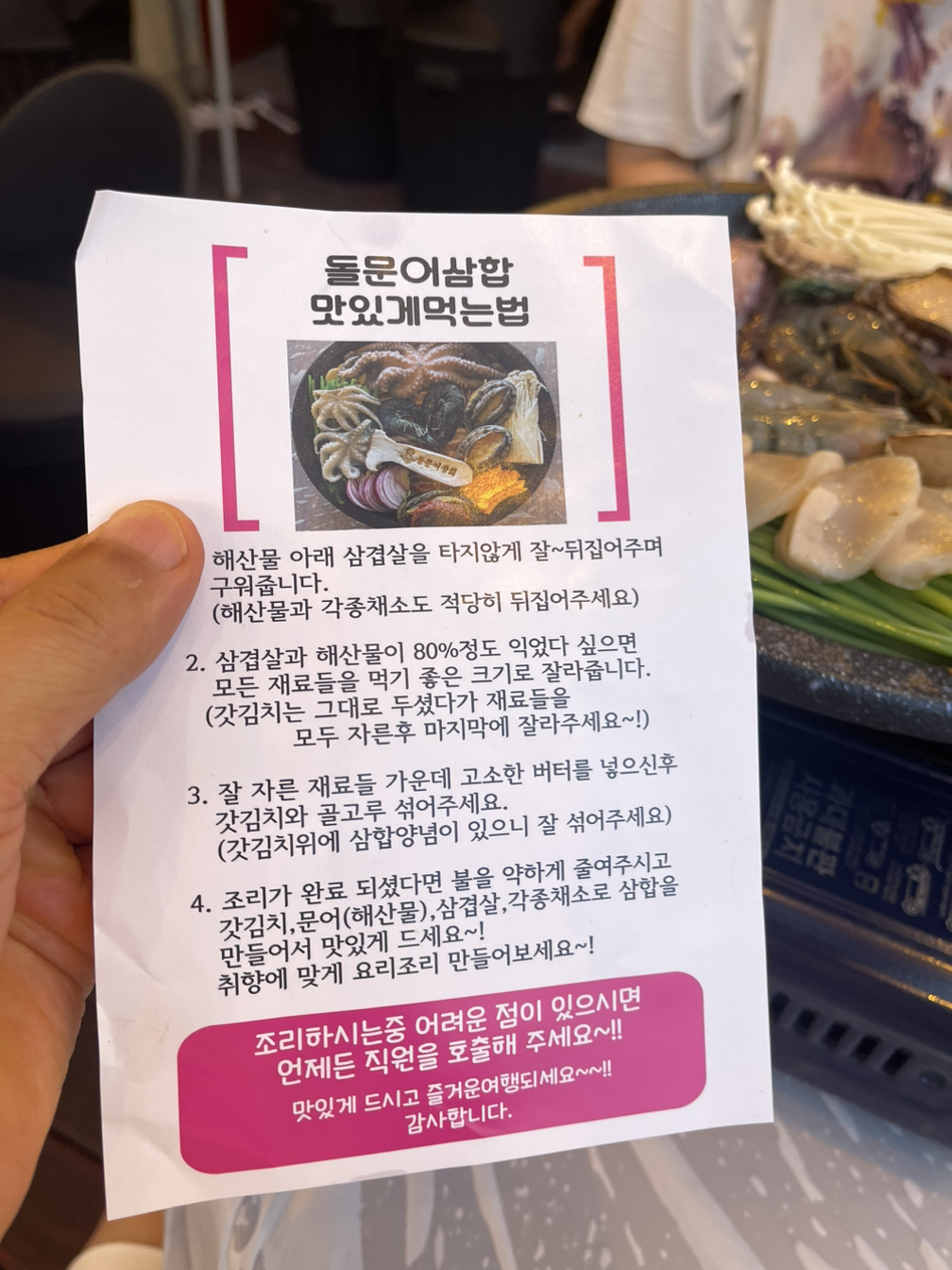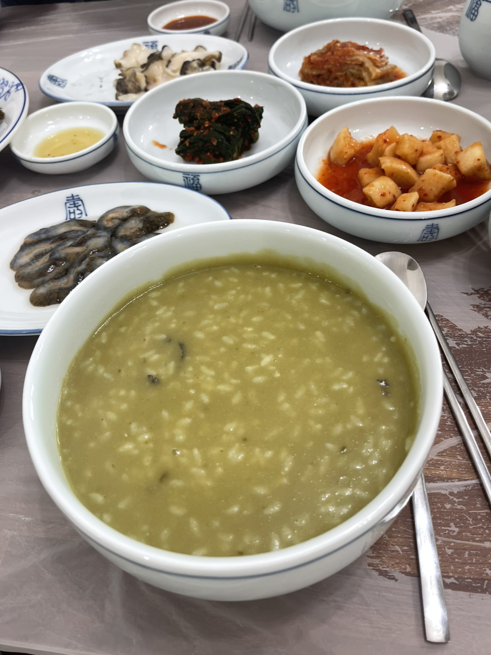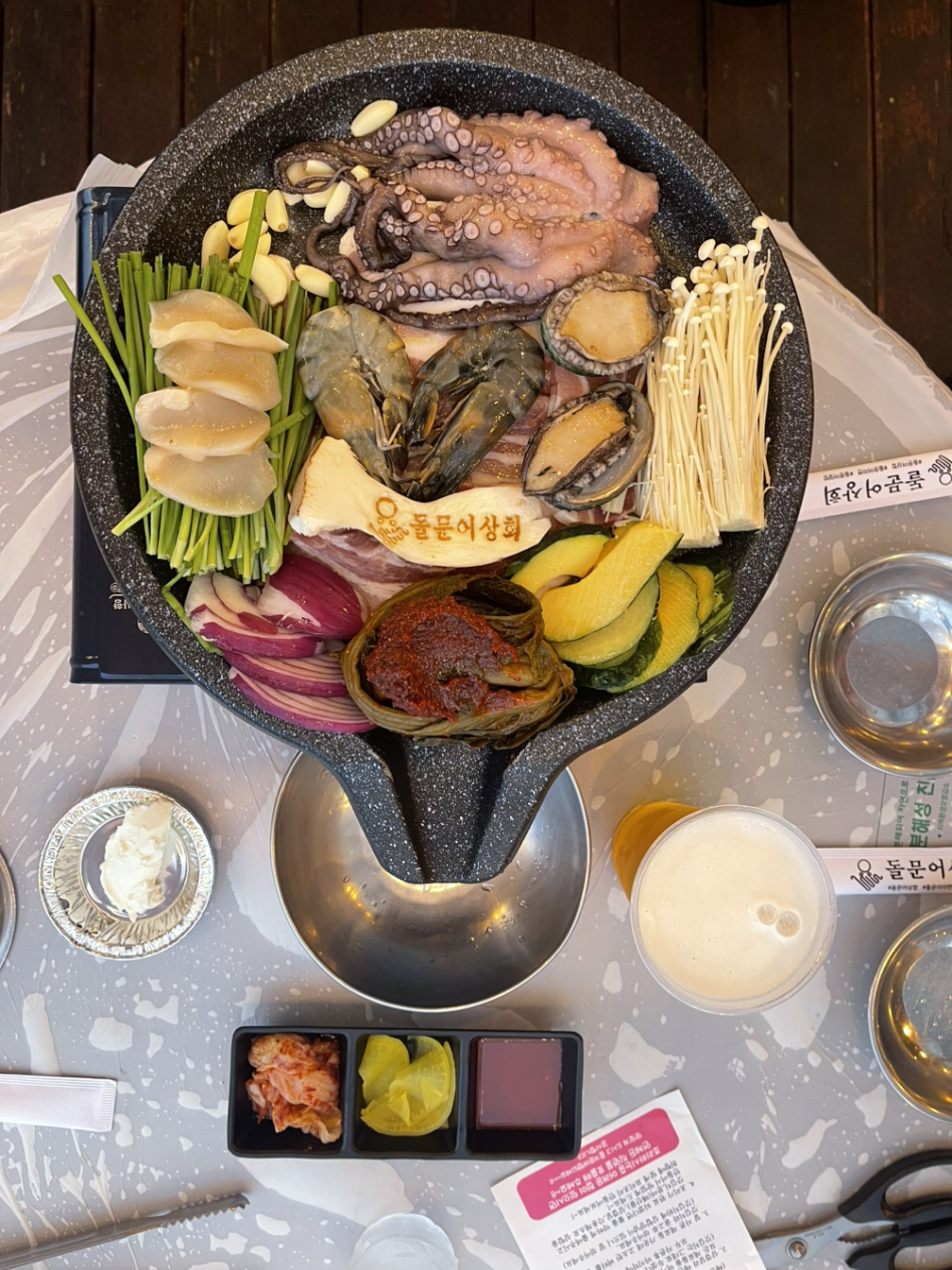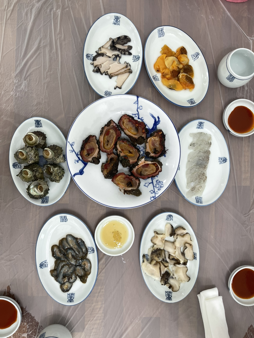 메뉴는 전북죽 하나. "가격이 좀 비싼데?" 싶은 마음이 모두에게 든다. "다른 메뉴는 없나요?" 묻자 서빙하시는 분이 대답하신다. "전복죽 주문하시면 해물 곁들이찬이 나옵니다". 아 여기는 그런 시스템이구나. 전북죽 셋을 주문하고 기다리다 입과 눈이 쩍 벌어지는 일이 생겼다. 곁들임 찬으로 가지고 온 해물 7가지를 차려 주신다. 그 퀄리티가... 와... 아... 대... 박... 딱! 우리가 먹기 좋을 만큼 분량의 해삼, 전복, 소라, 고동, 돌멍게, 멍게, 회를 차려 주신다. 배보다 배꼽이 훨씬 크고 고퀄리티인 상황. 그 싱싱함은 말할 필요도 없다. 한정식을 먹으려던 계획이 싹 사라졌다. 이 정도면 충분히 신선한 해물을 흡입하는 거다. 감동 그 자체.