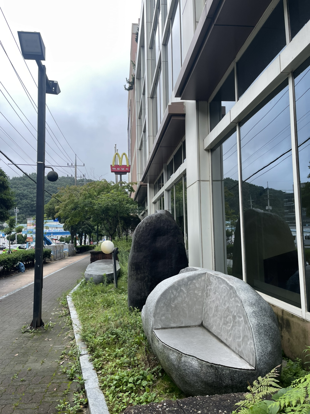 오전 시간은 K의 자유시간. 여수 시내 이마트에 있는 맥도널드 조식을 먹으러 갔으나 10시부터 연단다. 이런 맥도널드도 있다니... 다시 호텔 근처 스타벅스로 이동해 둥지를 틀고, 간단히 빵과 커피로 요기를 한다. 스타벅스 위치와 규모와 시설이 엄청나다. 서울을 벗어나면 모든 것이 여유로워진다. 이래서 '서울 촌놈'이라는 말이 농담이 아닌 것 같다. 맥도널드 앞 거리에 벤치가 돌이다. 호남지역에 오니 자연석을 많이 보게 된다.