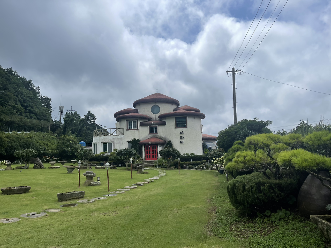우리가 신뢰하는 식당 정보 서적 '블루리본'이 추천하는 전복죽 전문식당 아와비를 중식처로 결정하고 이동한다. 바다 뷰를 보며 드라이브를 하다 보면 아주 후미진 막다른 길 느낌이 나는 어촌 마을을 만난다. 동네로 진입하며 작은 식당일 것이라고 예측했으나, 내비게이션이 알려주는 곳에 도착한 후 깜짝 놀랐다. 스머트들이 튀어나올 것 같은 버섯집이 근사한 잔디 조경 마당 위에 서 있다. 한눈에 관리가 잘 된 곳이라는 느낌이 강하게 든다.