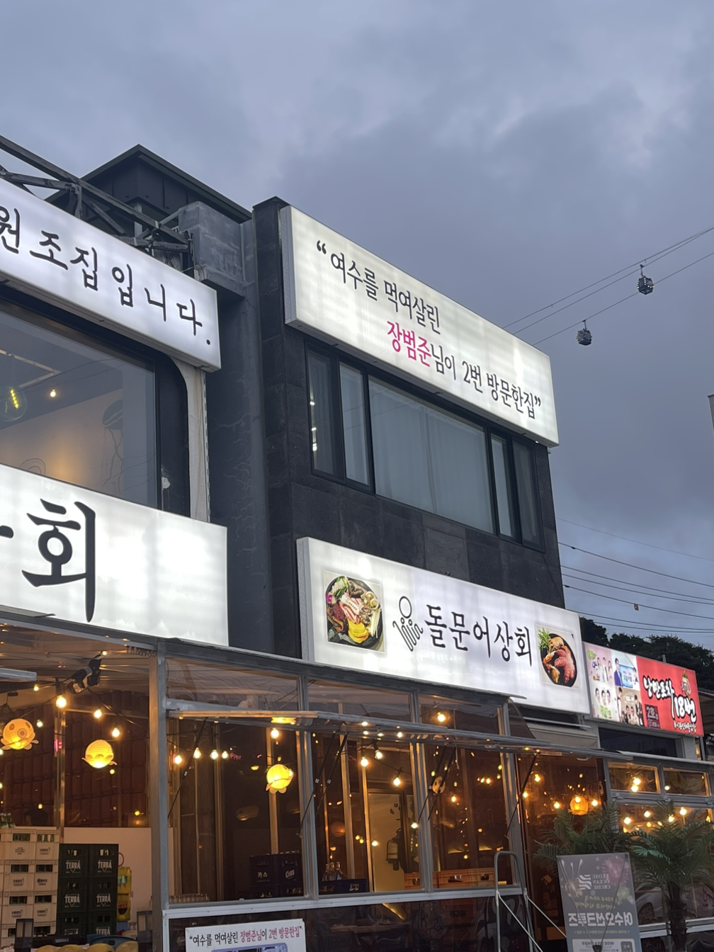 어느 바닷가가 그렇듯이 여수에도 젊은이들의 거리가 있다. 시내 이순신광장 옆 바닷가 거리를 여수 낭만포차거리라고 부른다. 여수에서 '삼합'이라고 부르는 철판 볶음 요리를 테마로 많은 식당들이 도열해 있다. "여수를 먹여 살린 장범준 님이 2번 방문한 집"이라는 재미있는 문구를 붙이고 있는 식당에 사람도 많고 하여 들어간다. 삼합과 해물라면을 주문하고 저녁식사를 한다. 삼합은 삼겹살과 문어, 그리고 각종 해산물과 갓김치를 넣고 볶아 먹는 요리이다. 호남지역의 전통 삼합과는 사뭇 다른 젊은이들이 만들어 낸 마케팅 요리인 듯싶다. 맛은 고기와 야채와 갓김치를 섞어 볶으니 맛없기도 힘들다. 마지막에 볶아 먹는 밥이 하이라이트다. 밥으로 마무리를 해야만 하는 우리는 한국인이다. 아무튼 여수시는 장범준 가수에게 두고두고 은혜를 갚아야 한다.