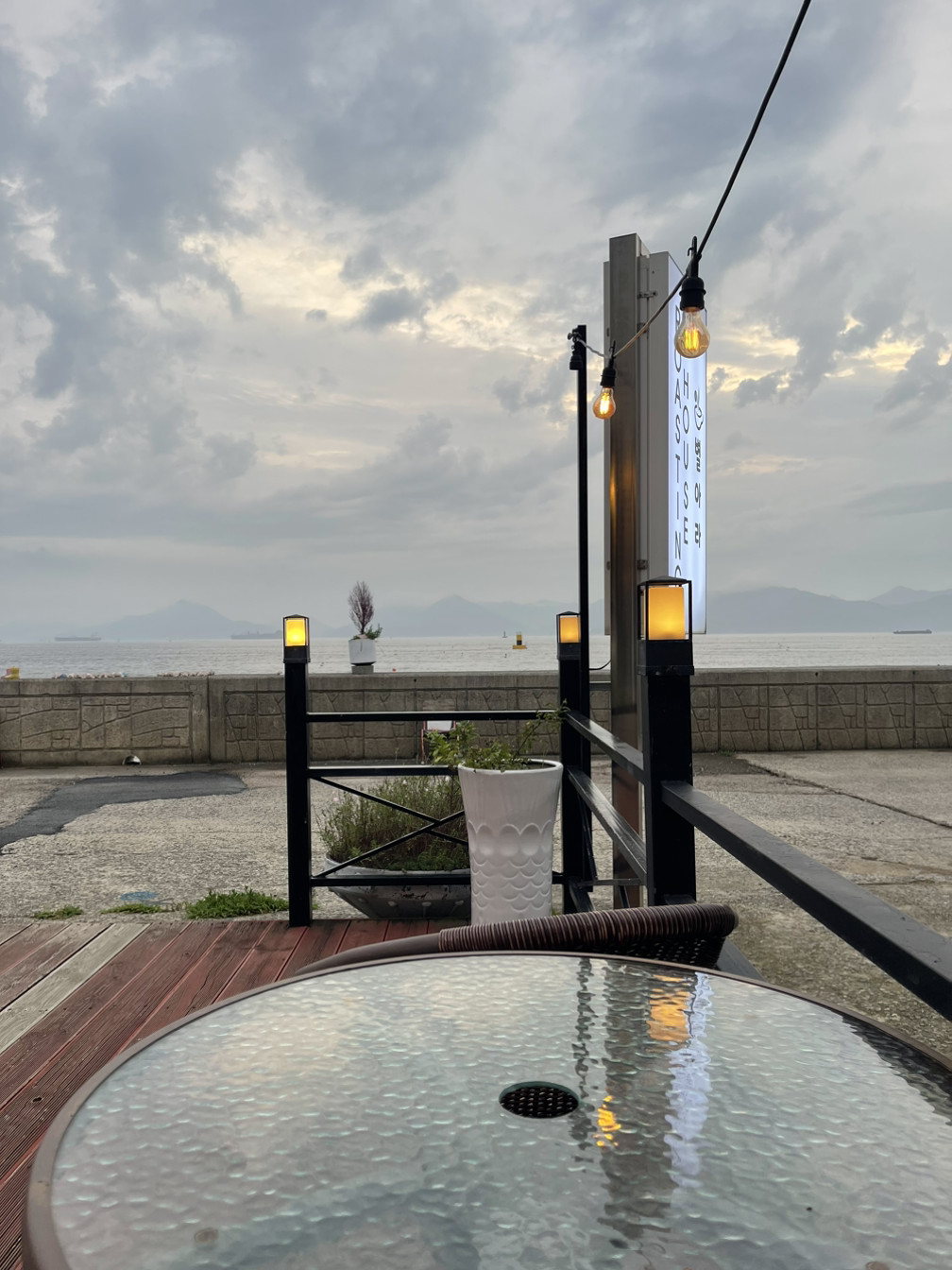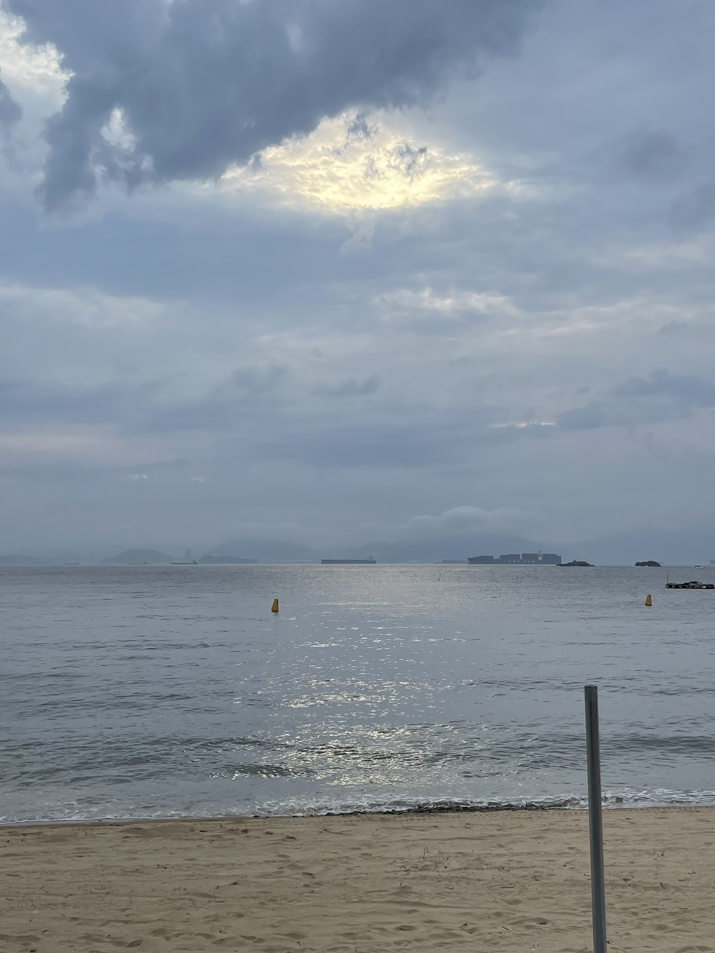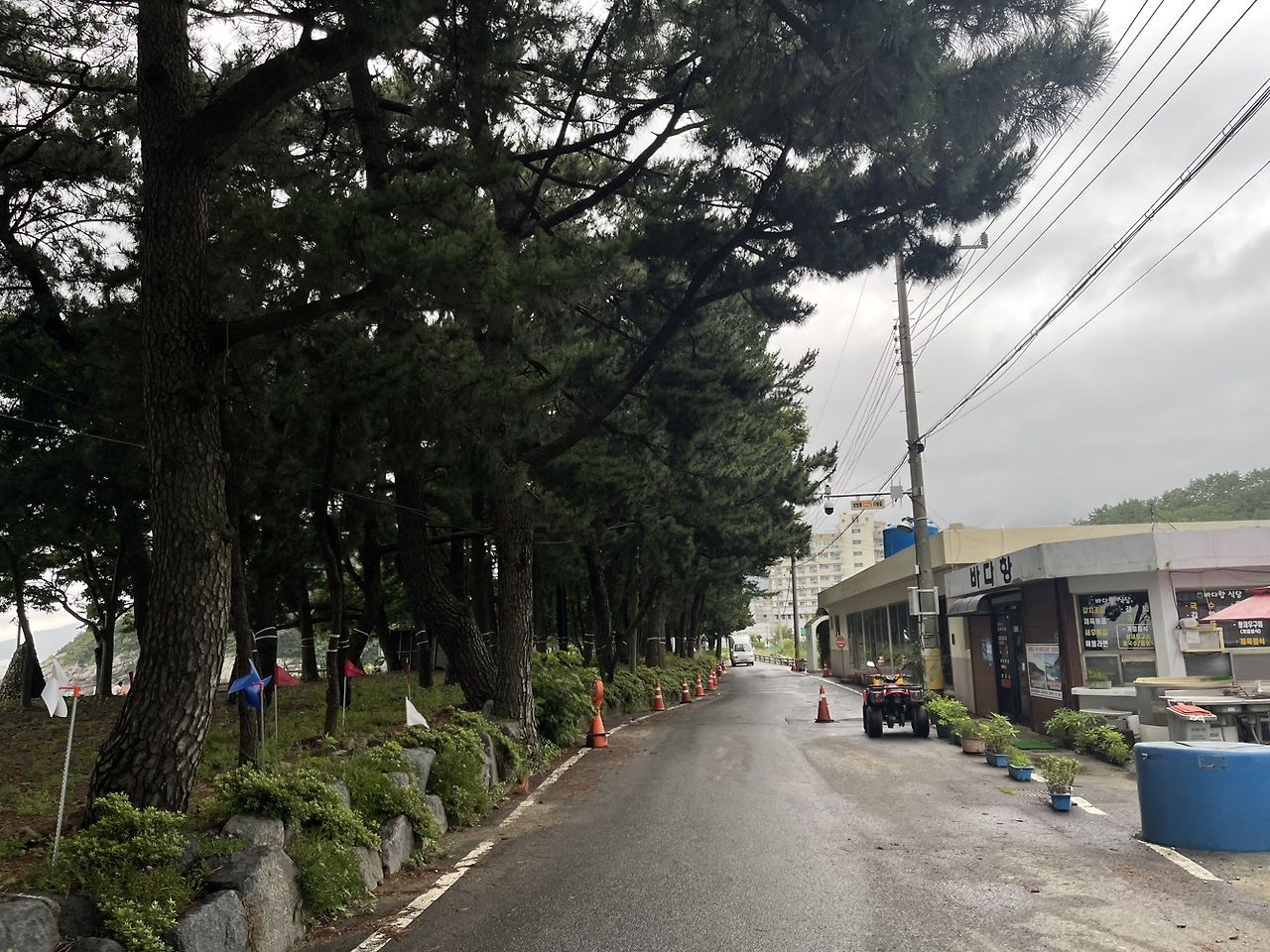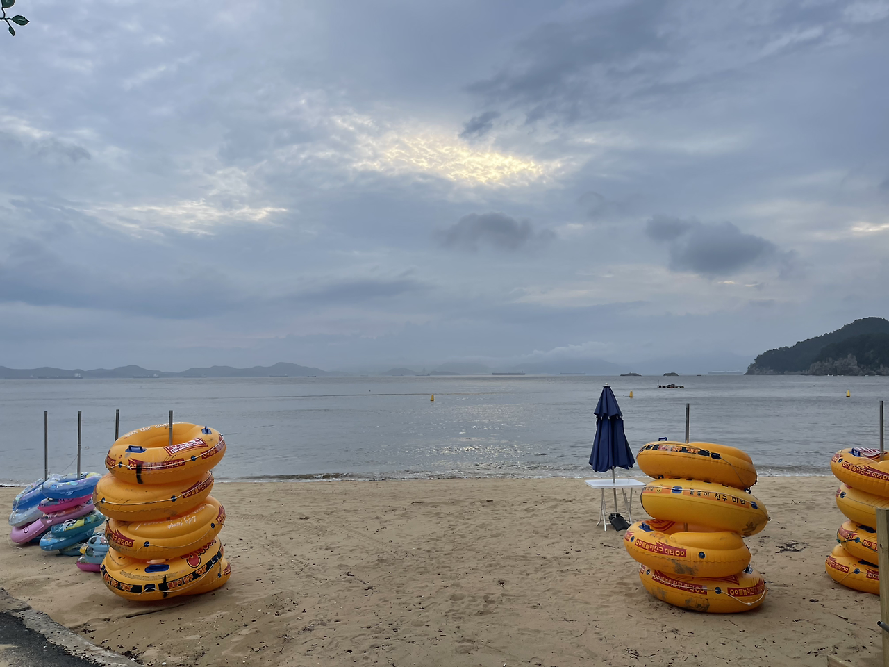 숙소 옆 카페로 이동하던 중 해수욕장으로 보이는 해변이 보여 잠시 들른다. 흐린 해변에는 아무도 없다. 두터운 구름 뒤에 해가 지고 있는 것이 느껴진다. 맑았다면 노을이 황홀했겠다. 프라이빗 비치 같이 호젓하다. 번쩍이는 노래방 간판도 포장마차 간판도 없는 것을 보니 아주 조용한 해변인 것 같다. 더워지면 해수욕하기 좋겠다. 호감 가는 해변이다. 다시 와봐야겠다.